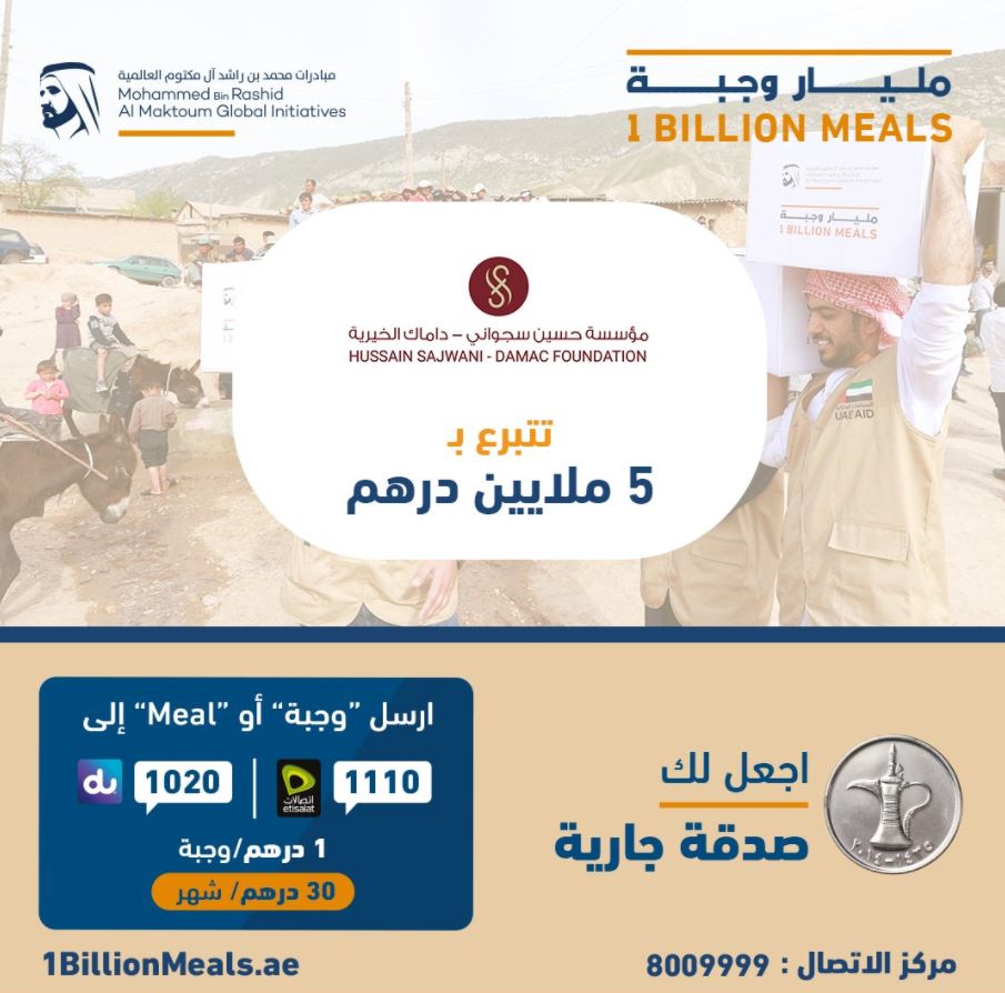 أعلنت مؤسسة حسين سجواني - داماك الخيرية عن تبرّعها بمبلغ 5 ملايين درهم لدعم مبادرة "المليار وجبة" التي تنظمها "مبادرات محمد بن راشد آل مكتوم العالمية"، لإغاثة المحتاجين في 50 دولة .