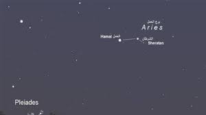 وأضاف الجروان أن نجوم راس برج الحمل سميت بـ "الشرطان" كونها الشرط أو العلامة لأنها أول النجوم الطوالع ..موضحا أن منزلة "الشرطان" راس الحمل وأول النجوم الشامية والمنزلة الثانية من منازل موسم /كنة الثريا/ الذي تختفي فيه نجوم الثريا عن الأنظار فالشرطان هما قرنا الحمل والبطين وهو بطن الحمل والثريا هي آلية الحمل وهي عنقود نجمي يشاهد كسحابة وتصنف الثريا حاليا على أنها جزء من مجموعة الثور النجمية، وخلال طلوع منزلة الشرطان تقترن نجوم الثريا بالشمس فتنتقل من نجم مسائي يشاهد في الجهة الغربية بعد غروب الشمس إلى نجم صباحي يشاهد في الجهة الشرقية قبل شروق الشمس ثم تتقدم تدريجيا في الطلوع.