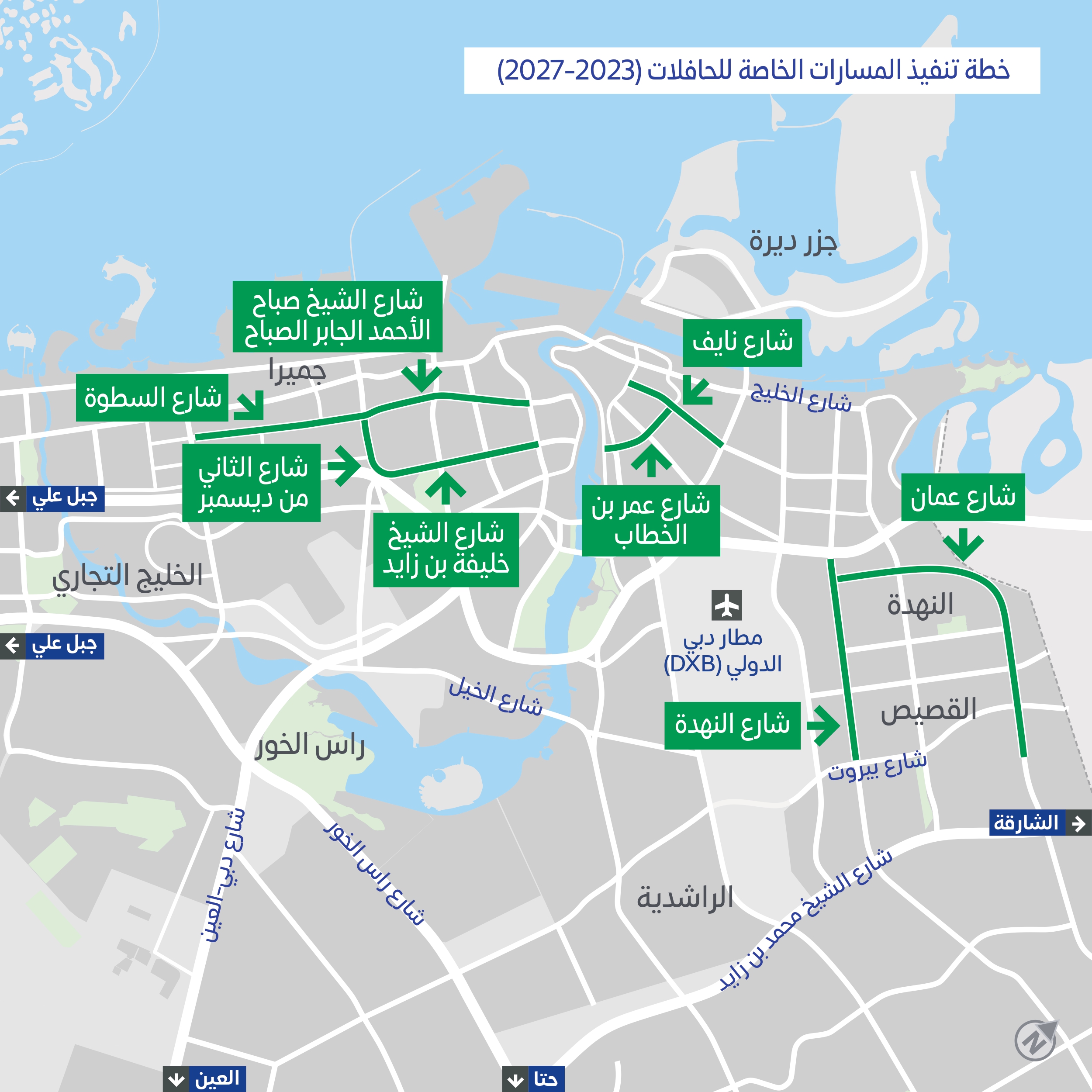 اعتمدت هيئة الطرق والمواصلات خطة تنفيذ مسارات خاصة للحافلات ومركبات الأجرة، بطول 37 كم، خلال الفترة من 2023 وحتى 2027، وتتوزع المسارات على ثمانية شوارع حيوية، هي شارع الشيخ خليفة بن زايد، والشيخ صباح الاحمد الجابر الصباح، والثاني من ديسمبر، وعمّان، والسطوة، والنهدة، وعمر بن الخطاب، ونايف، وبذلك يرتفع إجمالي طول المسارات الخاصة للحافلات إلى 48.6 كم.