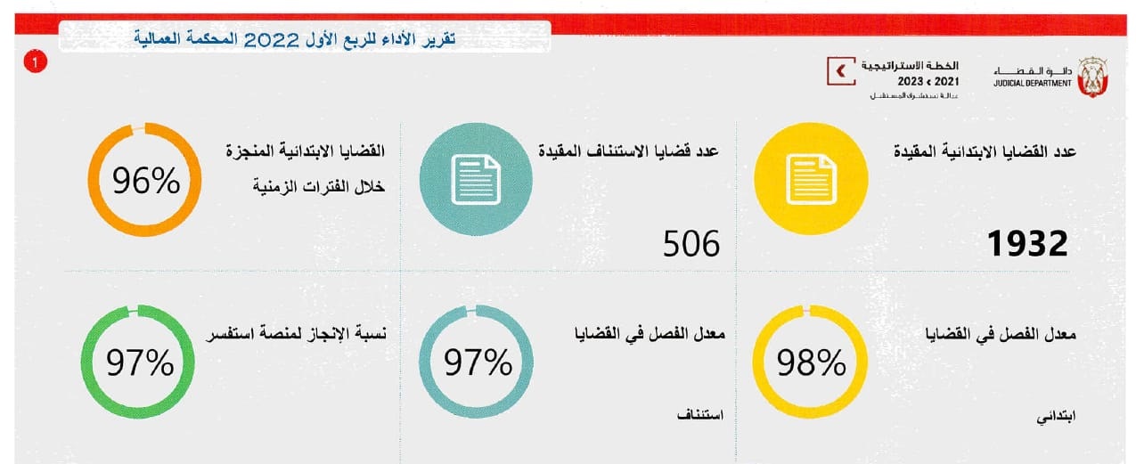 وأظهرت الإحصائيات الصادرة عن محكمة أبوظبي العمالية، خلال الربع الأول من العام الجاري، أن عدد القضايا الابتدائية المقيدة بلغ 1932 قضية تم الفصل في 98 % منها، أما عدد قضايا الاستئناف المقيدة فقد سجل 506 قضايا بلغت نسبة الفصل فيها 97 %، فيما وصل عدد الطلبات الإلكترونية المنجزة إلى 24 ألفا و 687 طلباً بنسبة إنجاز 100%، في حين سجلت منصة "استفسر" للرد على تساؤلات المتعاملين، 806 استفسارات، بنسبة إنجاز 97% خلال الفترات الزمنية المحددة.