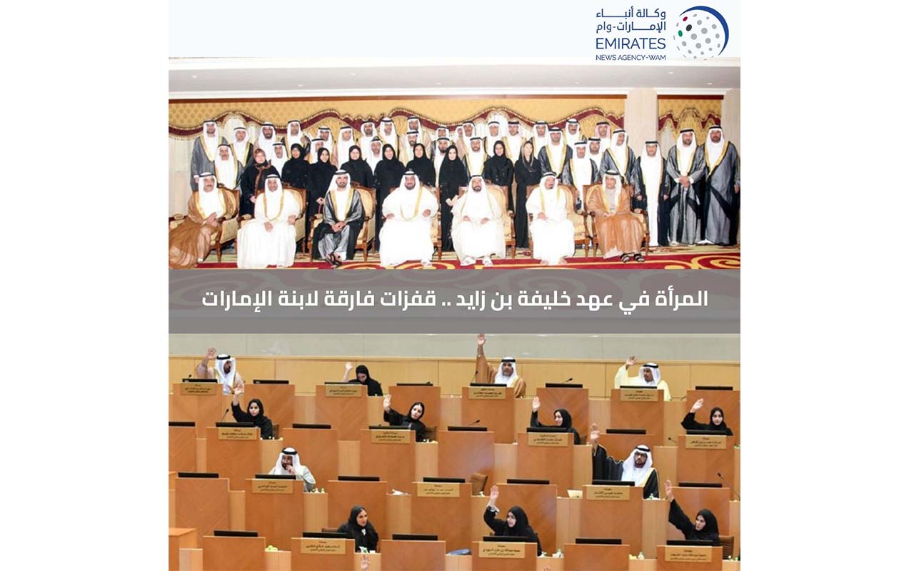 وسجل التاريخ قائمة من التحولات الفارقة في مسيرة المرأة الإماراتية خلال عهد المغفور له على مستويات عدة أهمها تنامي تمثيل المرأة في مجلس الوزراء، وحصولها على نصف مقاعد المجلس الوطني الاتحادي «البرلمان» وتقدمها في مؤشرات التوازن بين الجنسين عالمياً، ومساواة أجرها بالرجال، وتعزيز حضورها في قطاع الأعمال والعلوم، ومشاركتها في أبرز القطاعات الاستراتيجية كالفضاء والطاقة النظيفة وإتاحة المجال أمامها للالتحاق بالخدمة الوطنية بشكل اختياري، وإطلاق جوائز توثق إنجازات المرأة مثل جائزة الشيخة شمسة بنت سهيل للنساء المبدعات، وإصدار قرار بتعيين أول قاضية في دولة الإمارات، وتعيين أول وكيلتي نيابة للعمل بدائرة القضاء في إمارة أبوظبي.