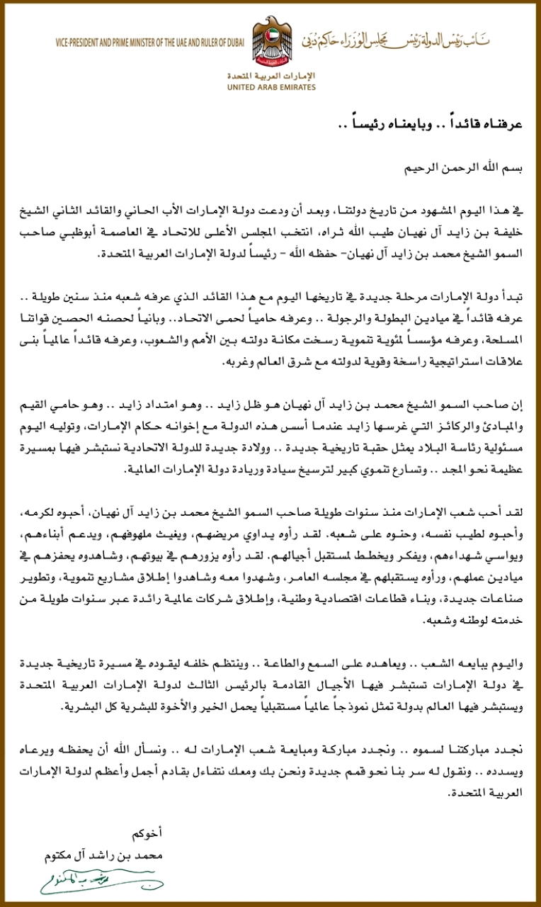 في هذا اليوم المشهود من تاريخ دولتنا، وبعد أن ودعت دولة الإمارات الأب الحاني والقائد الثاني الشيخ خليفة بن زايد آل نهيان، طيب الله ثراه، انتخب المجلس الأعلى للاتحاد في العاصمة أبوظبي، صاحب السمو الشيخ محمد بن زايد آل نهيان «حفظه الله» رئيساً لدولة الإمارات العربية المتحدة.