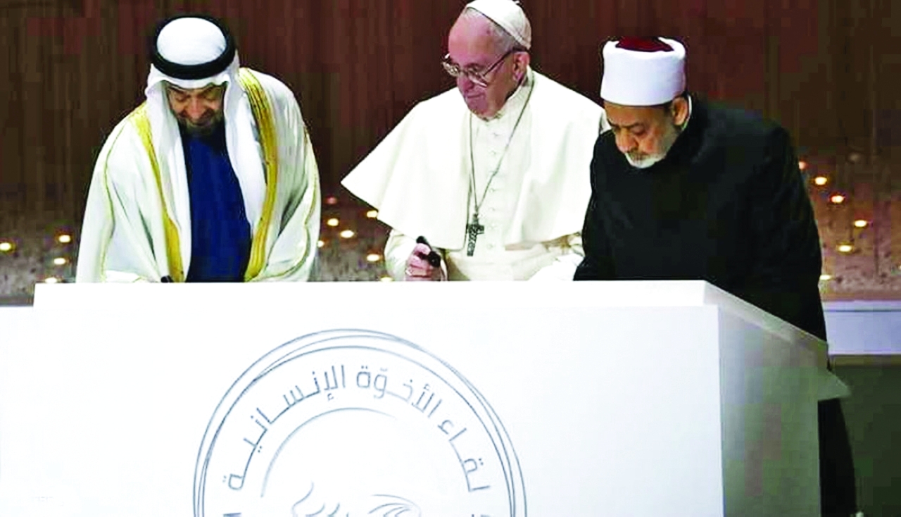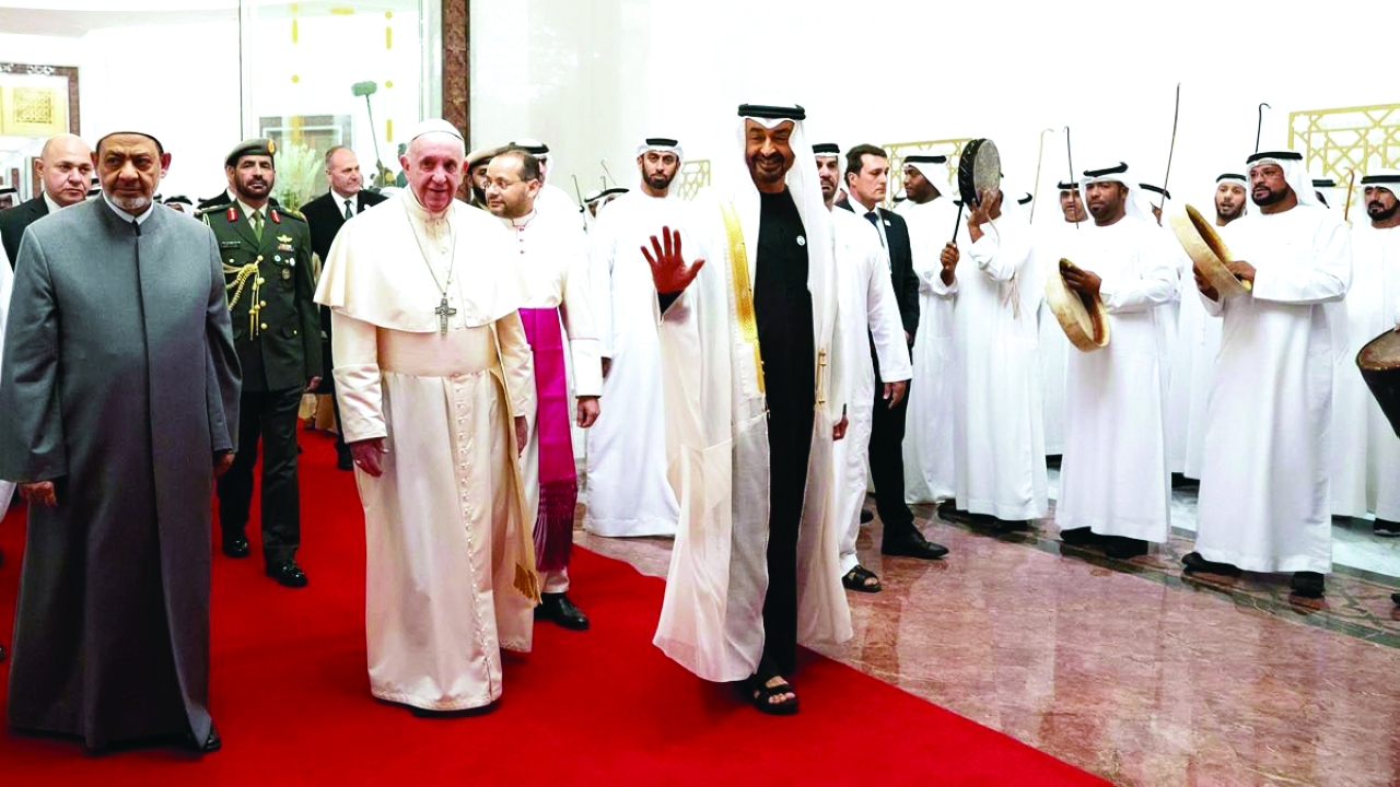 ومنذ إقرار الإمارات عام 2019 «عام التسامح»، تصدر صاحب السمو الشيخ محمد بن زايد آل نهيان المشهد بمواقفه وأقواله، ومن أبرزها استقباله اثنين من أهم القادة الدينيين في العالم، هما قداسة البابا فرنسيس بابا الكنيسة الكاثوليكية، وفضيلة الإمام الأكبر الدكتور أحمد الطيب، شيخ الأزهر الشريف، وقد تمخض اللقاء العالمي في العاصمة أبوظبي على توقيع «وثيقة الأخوة الإنسانية»؛ لتكون دليلاً على تعزيز ثقافة الاحترام المتبادل وتفعيل الحوار حول التعايش والتآخي بين البشر.