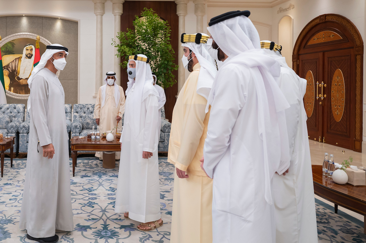 وتقبل التعازي إلى جانب صاحب السمو الشيخ محمد بن زايد آل نهيان كل من .. صاحب السمو الشيخ محمد بن راشد آل مكتوم نائب رئيس الدولة رئيس مجلس الوزراء حاكم دبي "رعاه الله" وصاحب السمو الشيخ حمد بن محمد الشرقي عضو المجلس الأعلى حاكم الفجيرة وصاحب السمو الشيخ سعود بن صقر القاسمي عضو المجلس الأعلى حاكم رأس الخيمة وسمو الشيخ حمدان بن محمد بن راشد آل مكتوم ولي عهد دبي وسمو الشيخ مكتوم بن محمد بن راشد آل مكتوم نائب حاكم دبي نائب رئيس مجلس الوزراء وزير المالية وسمو الشيخ محمد بن سعود بن صقر القاسمي ولي عهد رأس الخيمة وسمو الشيخ طحنون بن محمد آل نهيان ممثل الحاكم في منطقة العين وسمو الشيخ سيف بن محمد آل نهيان وسمو الشيخ سرور بن محمد آل نهيان وسمو الشيخ سعيد بن زايد آل نهيان ممثل حاكم أبوظبي وسمو الشيخ نهيان بن زايد آل نهيان رئيس مجلس أمناء مؤسسة زايد بن سلطان آل نهيان للأعمال الخيرية والإنسانية والفريق سمو الشيخ سيف بن زايد آل نهيان نائب رئيس مجلس الوزراء وزير الداخلية وسمو الشيخ طحنون بن زايد آل نهيان مستشار الأمن الوطني وسمو الشيخ منصور بن زايد آل نهيان نائب رئيس مجلس الوزراء وزير شؤون الرئاسة وسمو الشيخ حامد بن زايد آل نهيان عضو المجلس التنفيذي لإمارة أبوظبي وسمو الشيخ ذياب بن زايد آل نهيان وسمو الشيخ عبدالله بن زايد آل نهيان وزير الخارجية والتعاون الدولي وسمو الشيخ خالد بن زايد آل نهيان رئيس مجلس إدارة مؤسسة زايد العليا لأصحاب الهمم وسمو الشيخ الدكتور سلطان بن خليفة آل نهيان مستشار صاحب السمو رئيس الدولة وسمو الشيخ محمد بن خليفة آل نهيان عضو المجلس التنفيذي وسمو الشيخ خالد بن محمد بن زايد آل نهيان عضو المجلس التنفيذي رئيس مكتب أبوظبي التنفيذي وسمو الشيخ ذياب بن محمد بن زايد آل نهيان رئيس ديوان ولي عهد أبوظبي وعدد من الشيوخ.