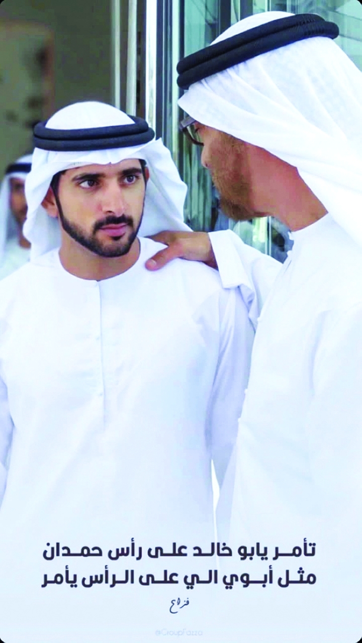 نشر سمو الشيخ حمدان بن محمد بن راشد آل مكتوم ولي عهد دبي صورة تجمعه بصاحب السمو الشيخ محمد بن زايد آل نهيان، رئيس الدولة، حفظه الله، عبر «تويتر» ،مدوناً عليها بيت شعر قال فيه: