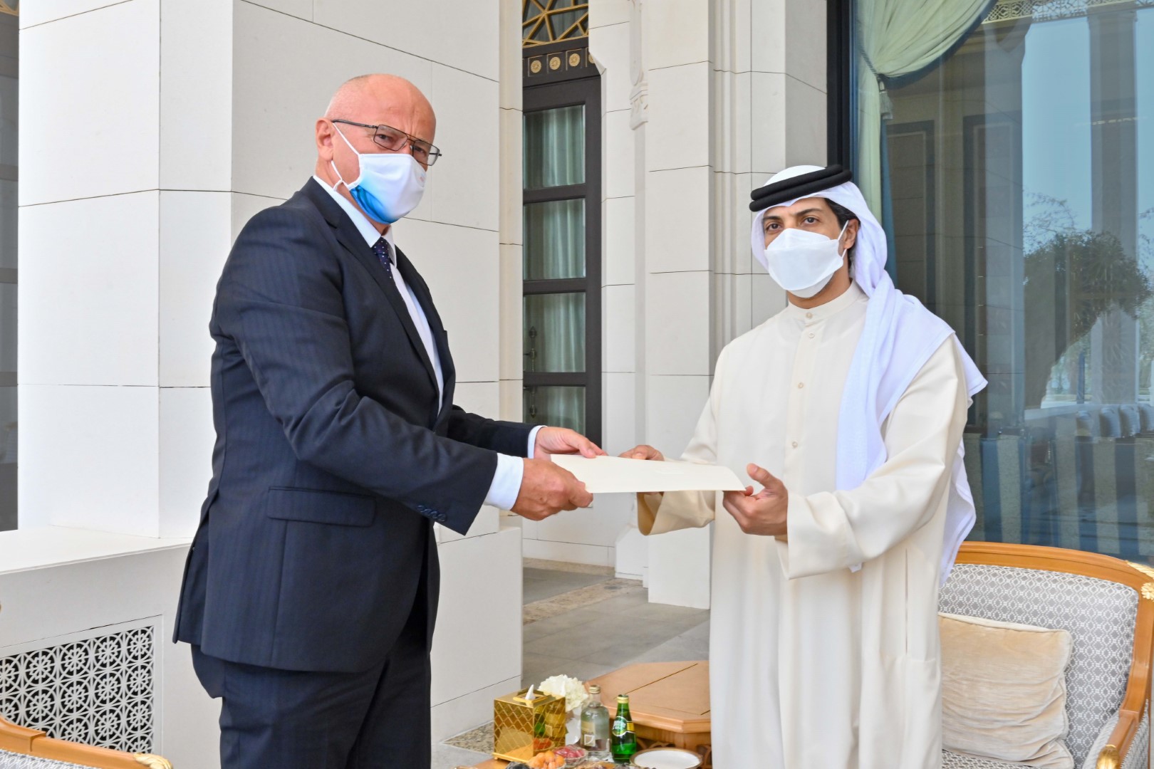 تسلم الرسالة سمو الشيخ منصور بن زايد آل نهيان نائب رئيس مجلس الوزراء وزير شؤون الرئاسة لدى استقباله سعادة بيري سلافيك سفير جمهورية التشيك لدى الدولة اليوم في قصر الوطن.