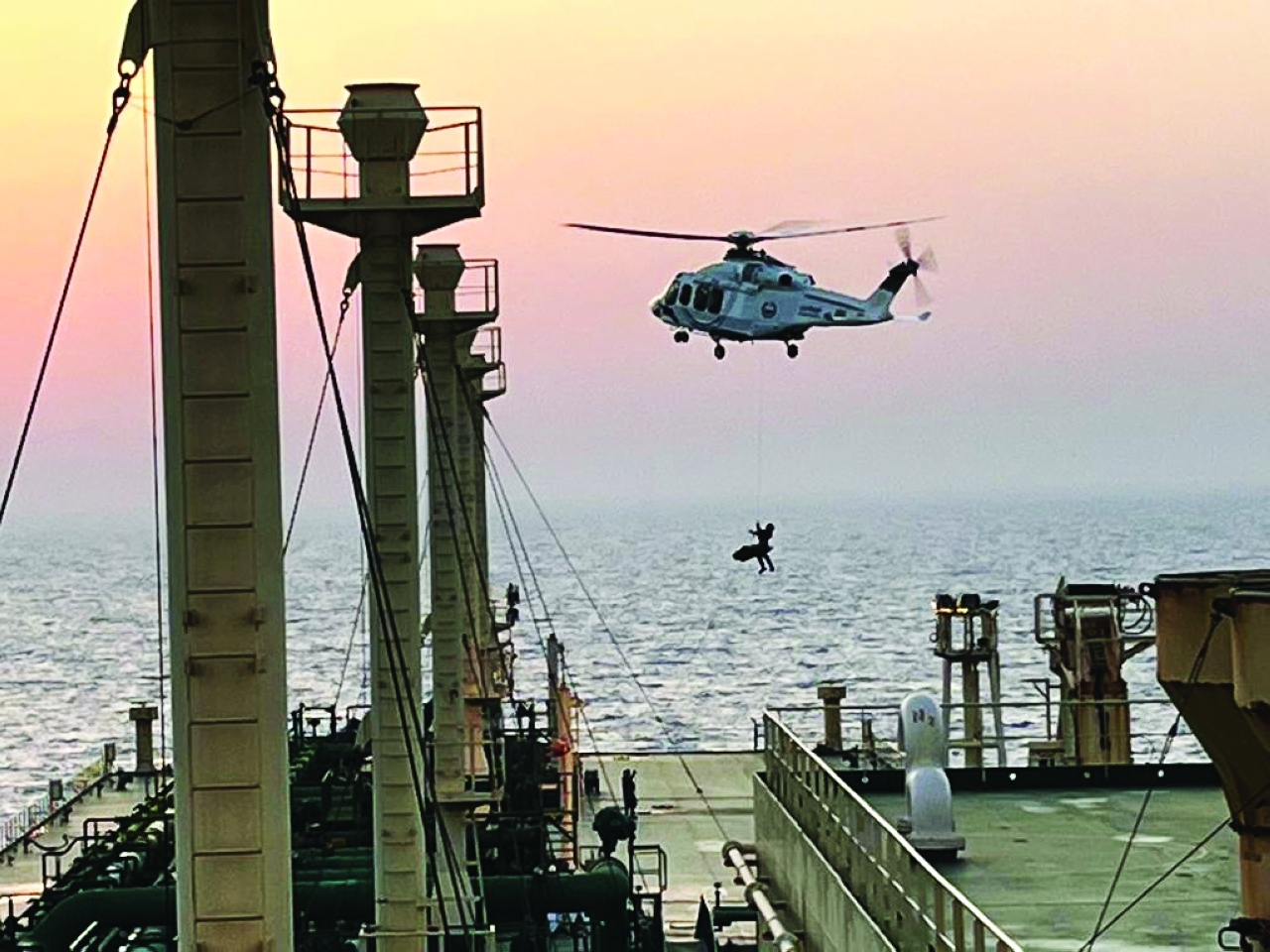 وأوضح أنه تبين لقائدي الطائرة عدم وجود مهبط على متن الباخرة ما استدعى تشغيل الرافعة المخصصة في عمليات الإنقاذ لإنزال المسعفين إلى سطحها ثم رفع أفراد الطاقم المريض إلى الطائرة، ومباشرة جرى تقديم كل الإسعافات الضرورية له لضمان استقرار الحالة قبل الوصول إلى المستشفى لاستكمال العلاج.