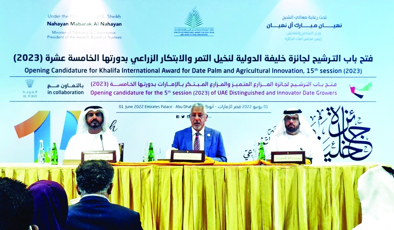 برعاية معالي الشيخ نهيان بن مبارك آل نهيان، وزير التسامح والتعايش، رئيس مجلس أمناء جائزة خليفة الدولية لنخيل التمر والابتكار الزراعي، أعلنت الأمانة العامة للجائزة عن فتح باب الترشيح لجائزة خليفة الدولية لنخيل التمر والابتكار الزراعي في دورتها الخامسة عشرة 2023، وفتح باب الترشيح لجائزة المزارع المتميز والمزارع المبتكر بالإمارات بدورتها الخامسة 2023 اعتباراً من أمس ولغاية 31 ديسمبر المقبل، بإتاحة المجال أمام كافة الأخوة المزارعين والمنتجين والباحثين والأكاديميين ومحبي شجرة نخيل التمر والابتكار الزراعي على مستوى دولة الإمارات وحول العالم، التقدم بطلباتهم للتنافس والفوز بإحدى فئات الجائزة الدولية أو الجائزة المحلية.