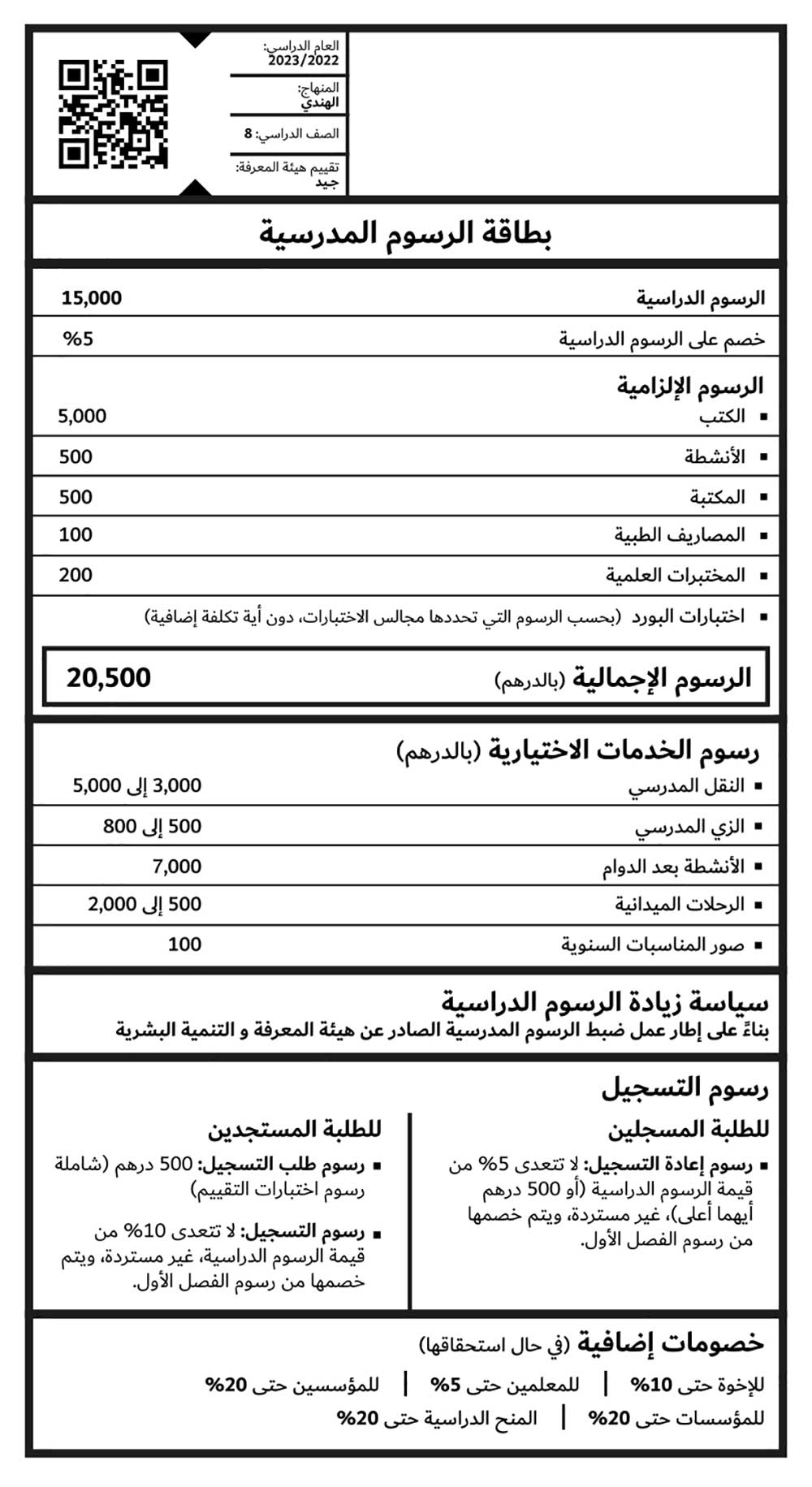 وقال الدكتور عبد الله الكرم، مدير عام هيئة المعرفة والتنمية البشرية: أصبحت بطاقة الرسوم المدرسية متوفرة الآن لجميع أولياء أمور الطلبة قبل بداية العام الدراسي في جميع المدارس الخاصة في دبي لتوفر جميع المعلومات والبيانات المُحدَّثة التي يحتاجون إليها حول رسوم مدارس أبنائهم.