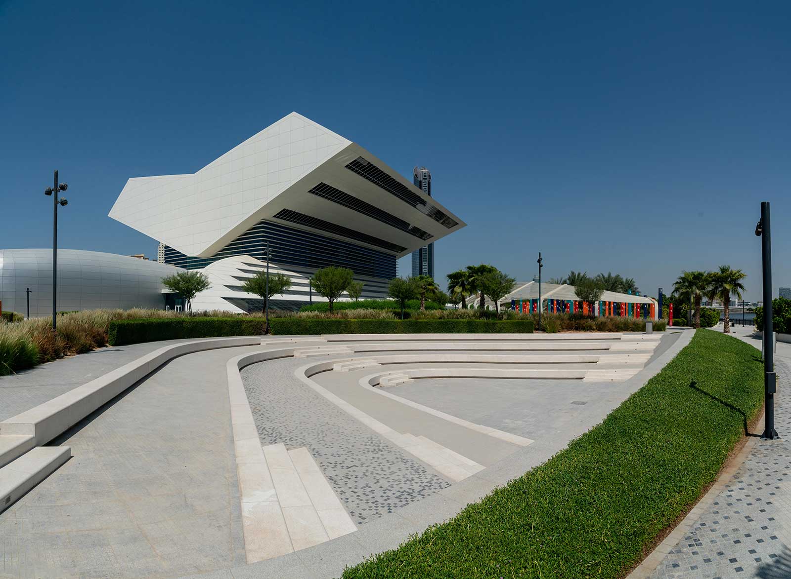 وإلى جانب المسرح الرئيس داخل مكتبة محمد بن راشد، هناك مسرح خارجي في الهواء الطلق، بالقرب من حديقة اللغات، يشكل فضاءً مثالياً لإقامة الفعاليات والعروض الحية الثقافية والفنية والموسيقية، خاصة خلال فصل الشتاء بطقسه الجميل.