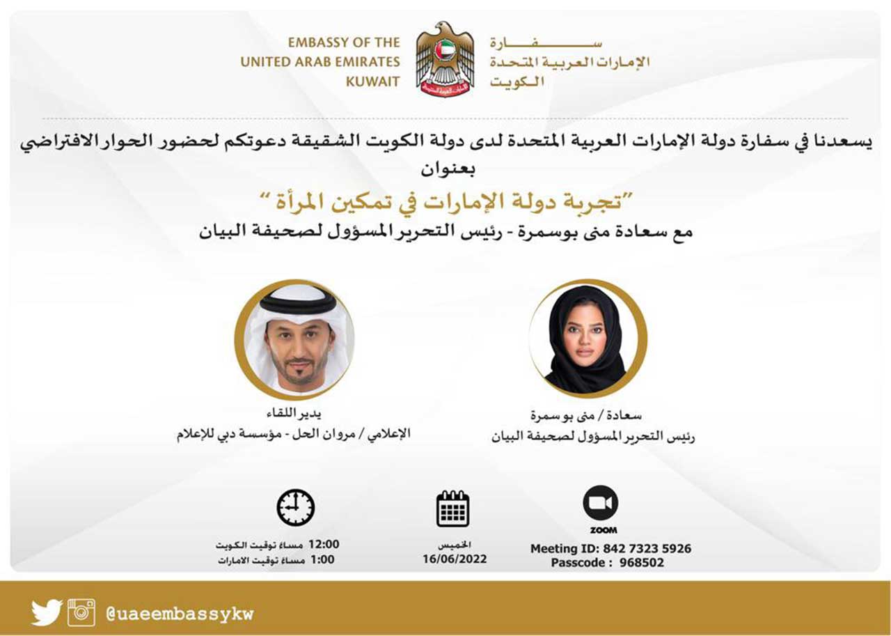 تنظم سفارة دولة الإمارات العربية المتحدة لدى دولة الكويت الشقيقة اليوم، حواراً افتراضياً بعنوان "تجربة دولة الإمارات في تمكين المرأة" تستضيف خلاله سعادة منى بوسمرة - رئيس التحرير المسؤول لصحيفة البيان.
