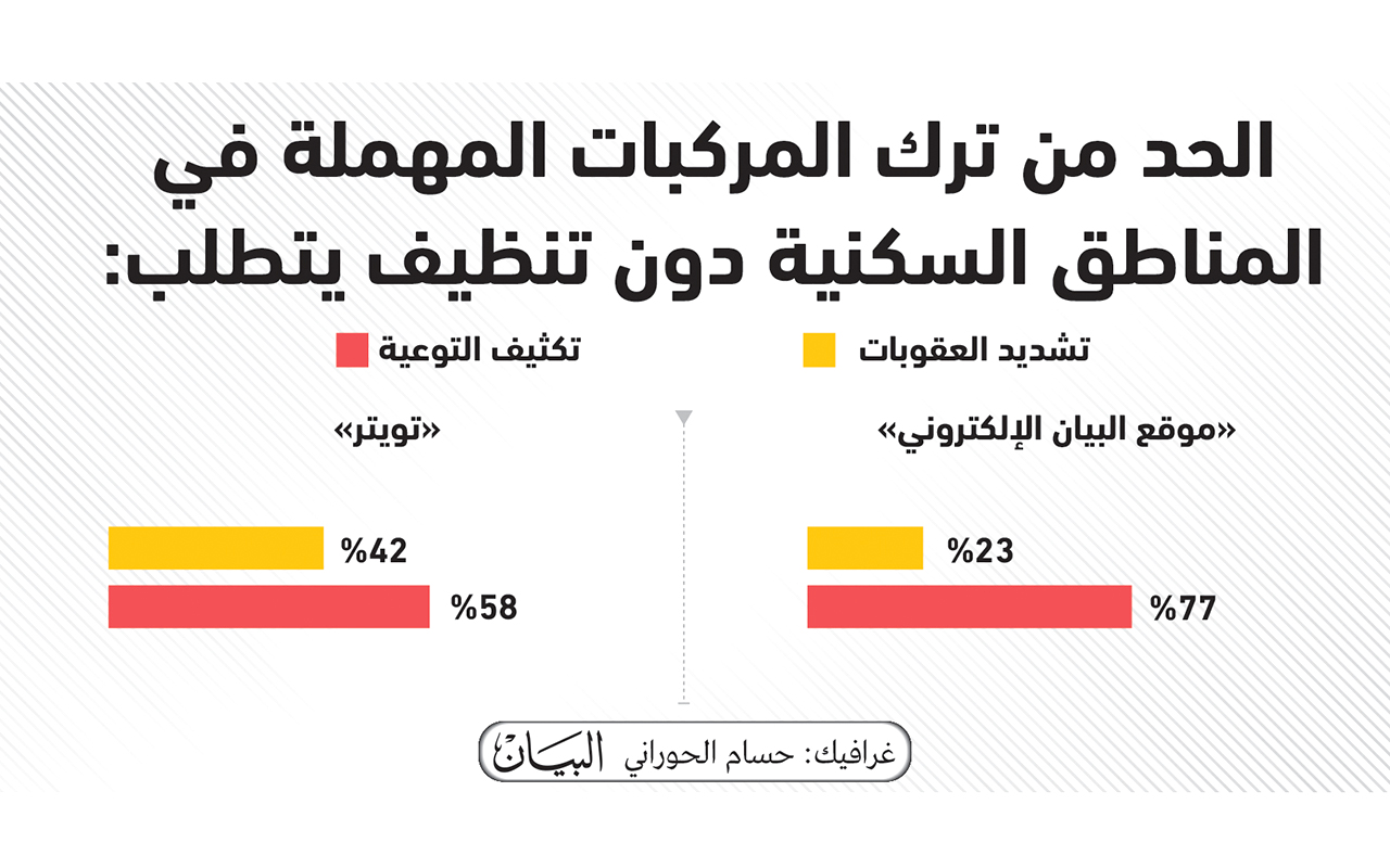 أكد مستطلعو «البيان الأسبوعي» عبر الموقع الإلكتروني وموقع التواصل الاجتماعي «تويتر»، أن تكثيف التوعية يمكن أن يحد من ترك المركبات المهملة في المناطق السكنية دون تنظيف مما يسيء إلى المظهر العام. وذكر 77 % من المستطلعة آراؤهم عبر الموقع الإلكتروني، أن تكثيف التوعية يمكن أن يحد من ترك المركبات المهملة في المناطق السكنية دون تنظيف، مقابل 23 % رأوا أن تشديد العقوبات يمكن أن يحد من تركها في تلك المناطق، وفي حساب الصحيفة عبر «تويتر» أكد 58 % أهمية زيادة وتكثيف التوعية، فيما رأى 42 % آخرون أن تشديد العقوبة على المخالفين يمكنه أن يحد من مخالفات ترك المركبات المهملة في المناطق السكنية والساحات دون تنظيف. وأكدت ميثاء جاسم شافي، مدير دائرة بلدية أم القيوين ـ فرع فلج المعلا، أن المركبات المهملة في الطرقات والساحات الخالية ووسط الأحياء السكنية تشوه المنظر الجمالي للمدينة، كما تشكل خطراً على الأطفال في حال الدخول إليها، لأنه من الممكن أن يغلق الباب وهم بداخلها، لذلك تنفذ فرق التفتيش بالبلدية العديد من الحملات التفتيشية الدورية في تلك المناطق لرصد السيارات المخالفة والعمل على إخطار أصحابها وفي حال عدم إزالتها وتنظيفها يتم سحبها بالتعاون مع إدارة المرور والدوريات بالقيادة العامة لشرطة أم القيوين، لافتة إلى أن مثل تلك الحملات تهدف إلى الحد من تشويه المظهر العام والحد من استغلال السيارات المهملة بشكل سيئ، ووقوفها لفترات طويلة، ما يعرضها للتلف والسرقة أو استغلالها في ممارسات غير مشروعة ومخالفة للأنظمة والقوانين.