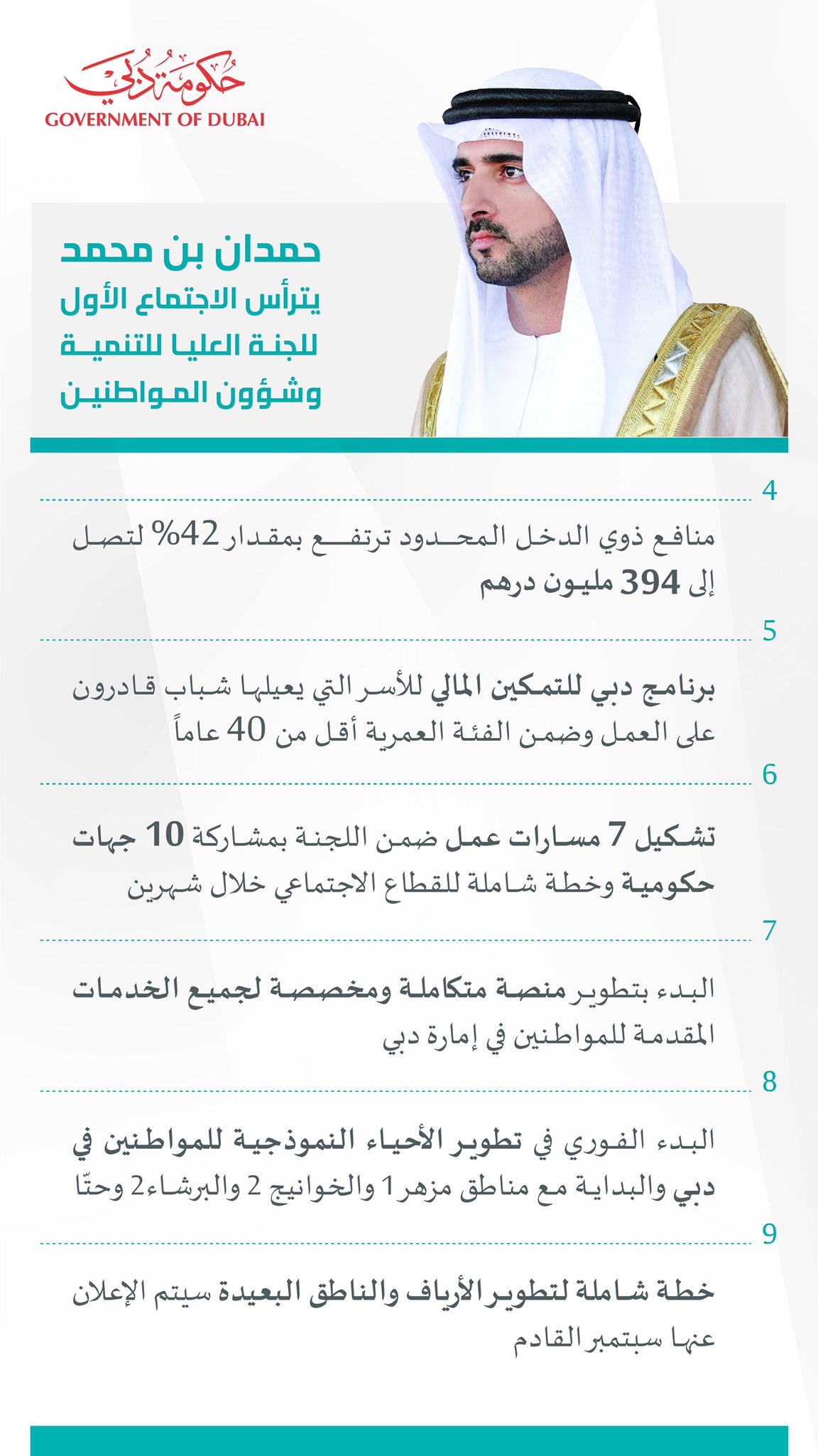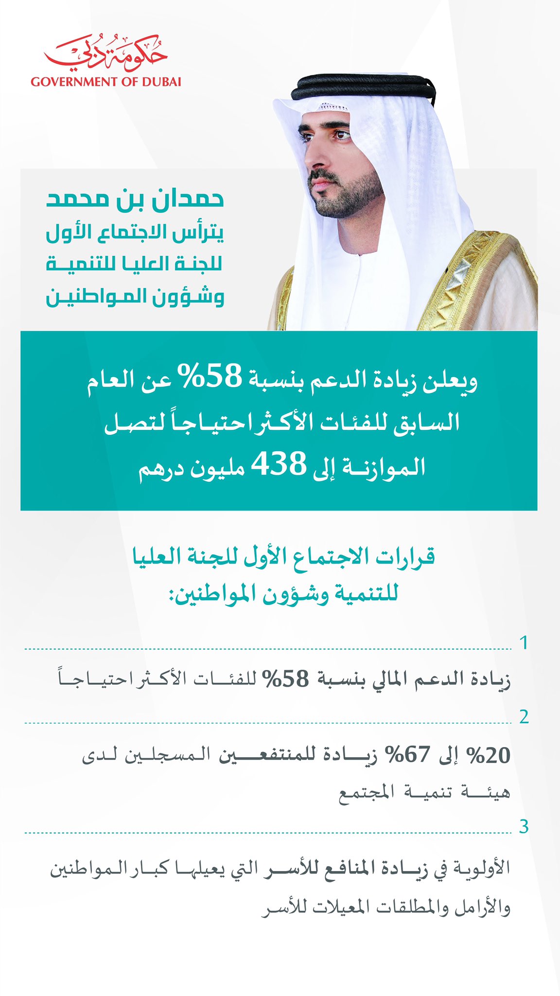 أعلن سمو الشيخ حمدان بن محمد بن راشد آل مكتوم، ولي عهد دبي، رئيس المجلس التنفيذي، عن زيادة الدعم للفئات الأكثر احتياجاً بنسبة 58% لتصل الميزانية إلى 438 مليون درهم.