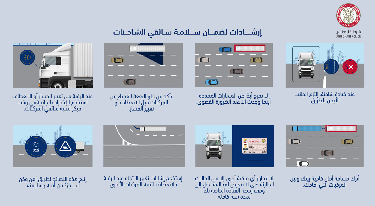 دعت شرطة أبوظبي سائقي الشاحنات للالتزام ب 7 إرشادات من أجل سلامتهم على الطريق : و التزام الجانب الأيمن للطريق ، عدم الخروج من المسار إلا للضرورة القصوى ، ترك مسافة أمان كافية بين الشاحنة والمركبات الأخرى،عدم تجاوز أي مركبة الا للحالات الطارئة لضمان عدم التعرض لمخالفة تصل إلى وقف رخصة القيادة لمدة عام كامل، والتأكد من خلو النقطة العمياء تماما من المركبات قبل الانعطاف أو تغيير المسار، وفي حال الضرورة لتغيير المسار أو الانعطاف ضرورة استخدام الإشارات الجانبية في وقت مبكر لتنبيه سائقي المركبات، إستخدام إشارات تغيير الاتجاه عند الرغبة بالانعطاف لتنبيه المركبات الأخرى .