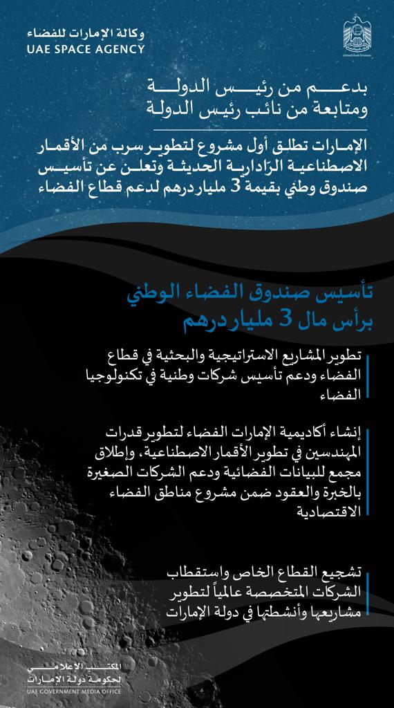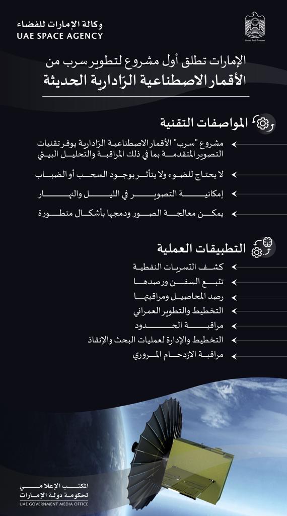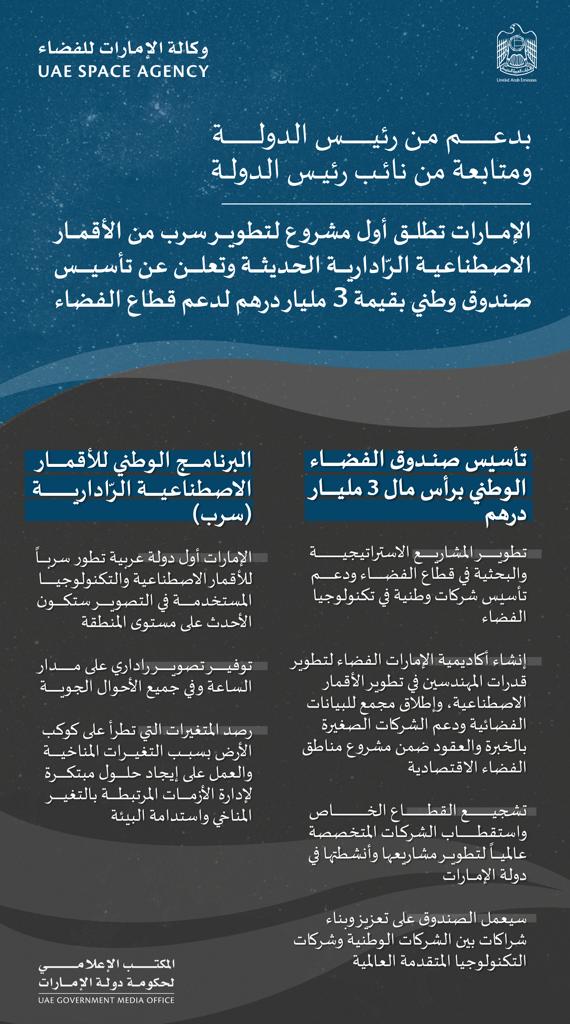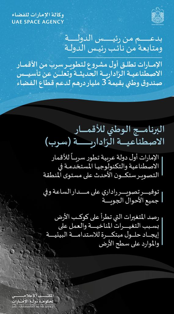 بدعم من صاحب السمو الشيخ محمد بن زايد آل نهيان، رئيس الدولة "حفظه الله"، ومتابعة صاحب السمو الشيخ محمد بن راشد آل مكتوم، نائب رئيس الدولة رئيس مجلس الوزراء حاكم دبي "رعاه الله"، أطلقت الإمارات اليوم البرنامج الوطني للأقمار الاصطناعية الرّادارية /سرب/ لتطوير سرب من الأقمار الرّادارية والذي يوفر تصوير راداري على مدار الساعة وفي جميع الأحوال الجوية، في حين تم الإعلان كذلك عن تأسيس صندوق وطني بقيمة 3 مليار درهم لدعم قطاع الفضاء في الدولة.