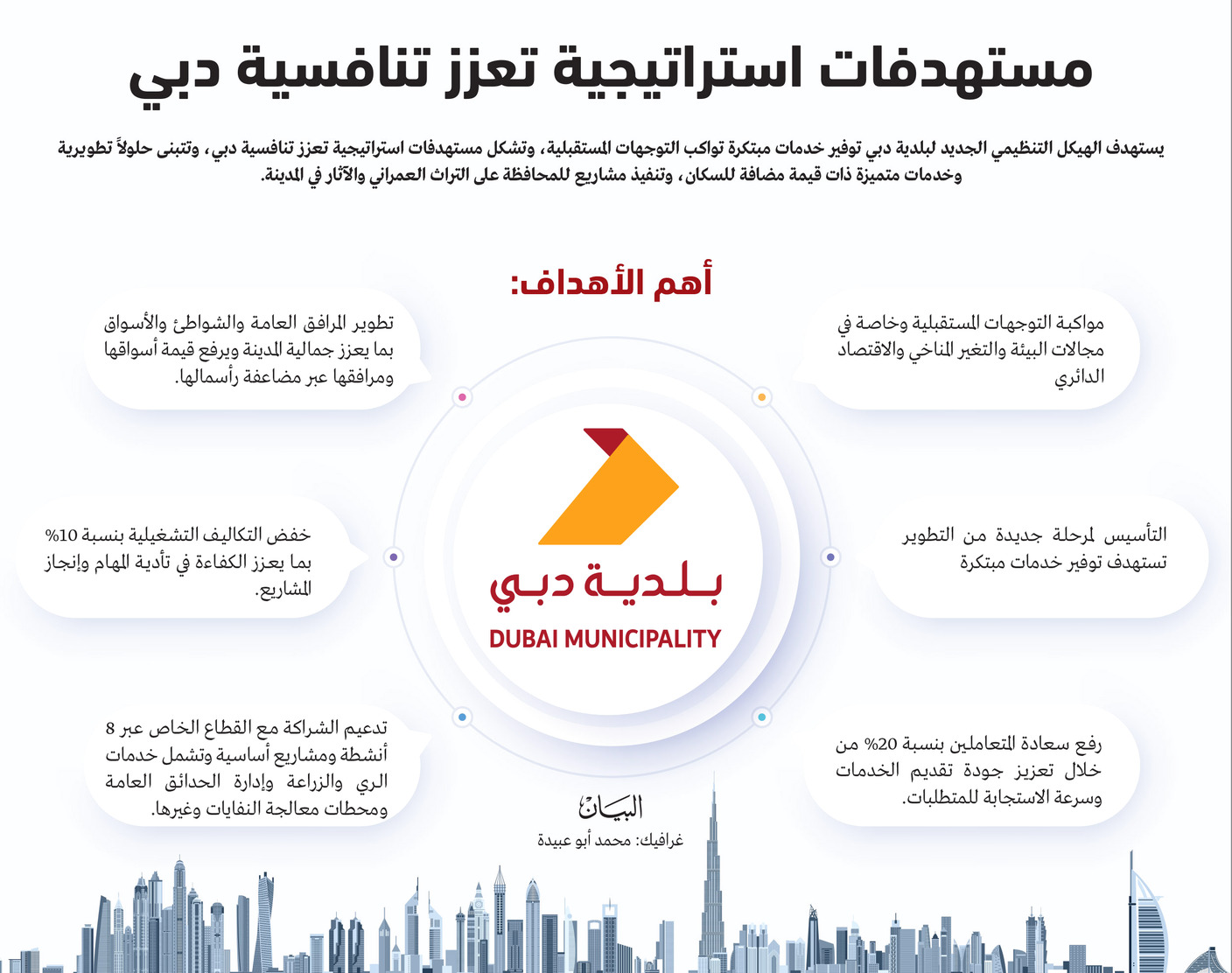وتشمل المستهدفات الاستراتيجية التي سيعمل الهيكل التنظيمي الجديد لبلدية دبي على تحقيقها، تعزيز الاستدامة المالية والحوكمة من خلال خفض الكلفة التشغيلية بنسبة 10% مع رفع جودة الخدمات وإسعاد سكان المدينة بنسبة 20%، إلى جانب تعظيم الأثر الاقتصادي والسياحي والتجاري للأصول العامة التابعة للبلدية، والعمل على تخصيص 8 أنشطة رئيسة للبلدية لتكون بالشراكة مع القطاع الخاص، بما يحقق رؤية القيادة بأن تكون دبي المدينة الأفضل للحياة في العالم، ويعزز جودة الحياة في الإمارة ويرسخ ريادتها في المؤشرات التنافسية، ويدعم مخرجات الحوكمة والشراكة مع القطاع الخاص.