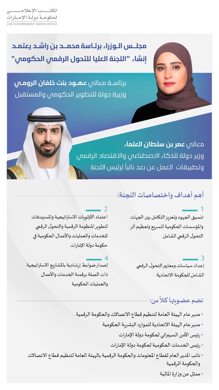 اعتمد مجلس الوزراء برئاسة صاحب السمو الشيخ محمد بن راشد آل مكتوم، نائب رئيس الدولة رئيس مجلس الوزراء حاكم دبي، رعاه الله، تشكيل اللجنة العليا للتحول الرقمي الحكومي، برئاسة معالي عهود بنت خلفان الرومي، وزيرة دولة للتطوير الحكومي والمستقبل ومعالي عمر بن سلطان العلماء - وزير دولة للذكاء الاصطناعي والاقتصاد الرقمي وتطبيقات العمل عن بعد نائباً لرئيس اللجنة.