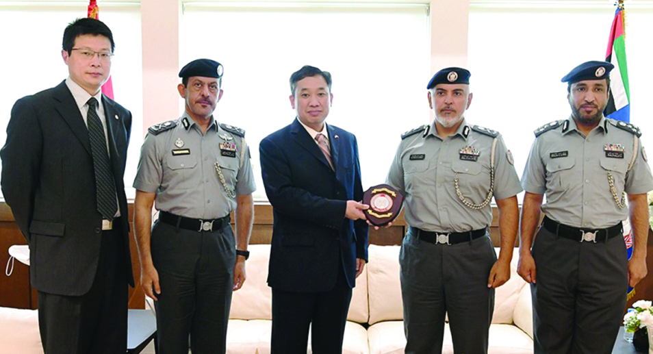 التقى اللواء مكتوم علي الشريفي، مدير عام شرطة أبوظبي، في مكتبه، المستشار هايفينغ جيانغ الملحق الشرطي الصيني، يرافقه هو اتشين سكرتير ثاني بسفارة جمهورية الصين الشعبية لدى الدولة.