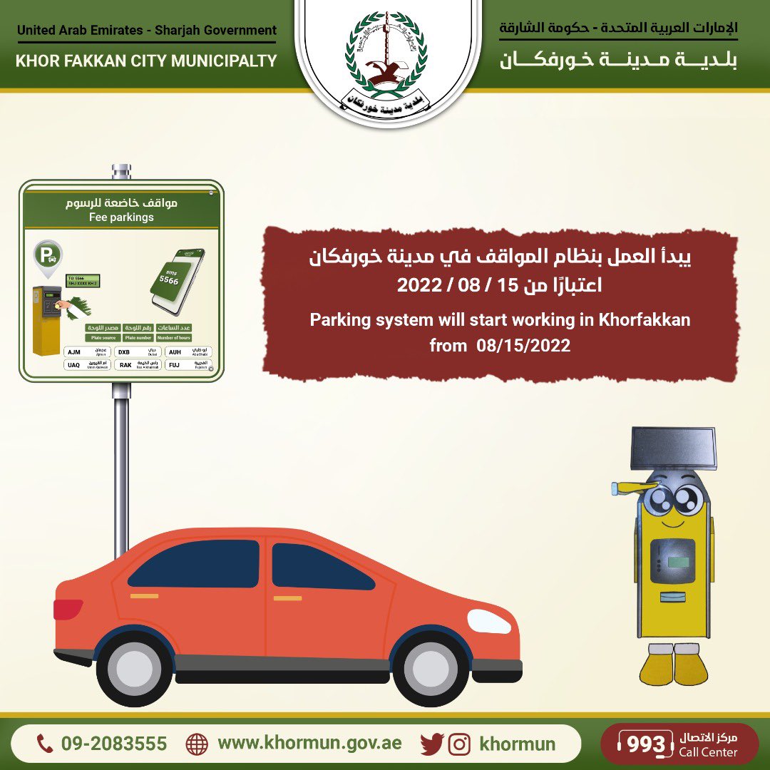 بدء العمل بنظام المواقف في خورفكان اعتباراً من 15 أغسطس الجاري البيانأعلنت بلدية مدينة خورفكان أن العمل بنظام المواقف في المدينة سيبدأ اعتبارًا من 15 / 08 / 2022.