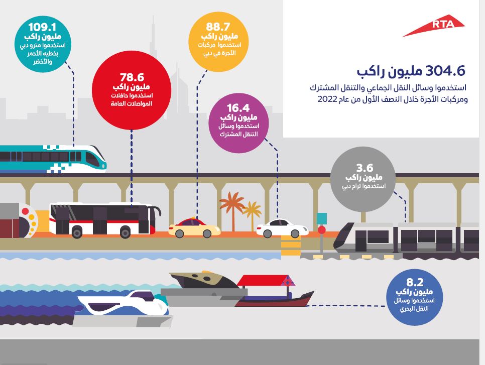 أعلنت هيئة الطرق والمواصلات أن عدد مستخدمي وسائل النقل الجماعي والتنقل المشترك في دبي التي تشمل مترو دبي وترام دبي وحافلات المواصلات العامة، ووسائل النقل البحري: (العبرات والفيري والتاكسي المائي والباص المائي)، ومركبات الحجز الإلكتروني ومركبات التأجير الذكي، والحافلات تحت الطلب إضافة إلى مركبات الأجرة (تاكسي دبي وشركات الامتياز) في النصف الأول من عام 2022، بلغ حوالي 304.6 ملايين راكب، مقارنة بنحو 202 مليون راكب في النصف الأول من عام 2021، وبلغ المتوسط اليومي لعدد مستخدمي وسائل النقل الجماعي والتنقل المشترك ومركبات الأجرة في النصف الأول من العام الجاري قرابة (1.68) مليون راكب، مقارنة بنحو (1.1) مليون راكب في الفترة نفسها من عام 2021.