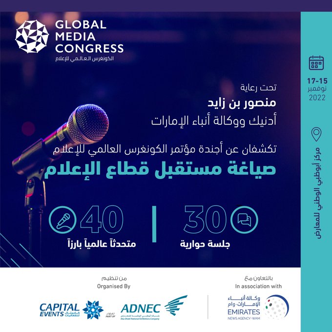 ويُقام معرض ومؤتمر الكونغرس العالمي للإعلام في الفترة من 15 إلى 17 نوفمبر المقبل بالشراكة بين شركة أبوظبي الوطنية للمعارض /أدنيك/ ووكالة أنباء الإمارات /وام/، لاستكشاف أحدث التطورات في قطاع الإعلام وآفاقه المستقبلية.
