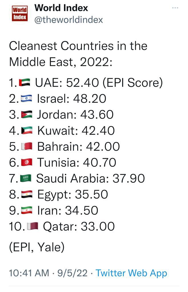 تصدّرت الإمارات منطقة الشرق الأوسط وشمال أفريقيا في النظافة، بحسب نتائج «مؤشر الأداء البيئي 2022»، الصادر عن «جامعة ييل» الأمريكية.