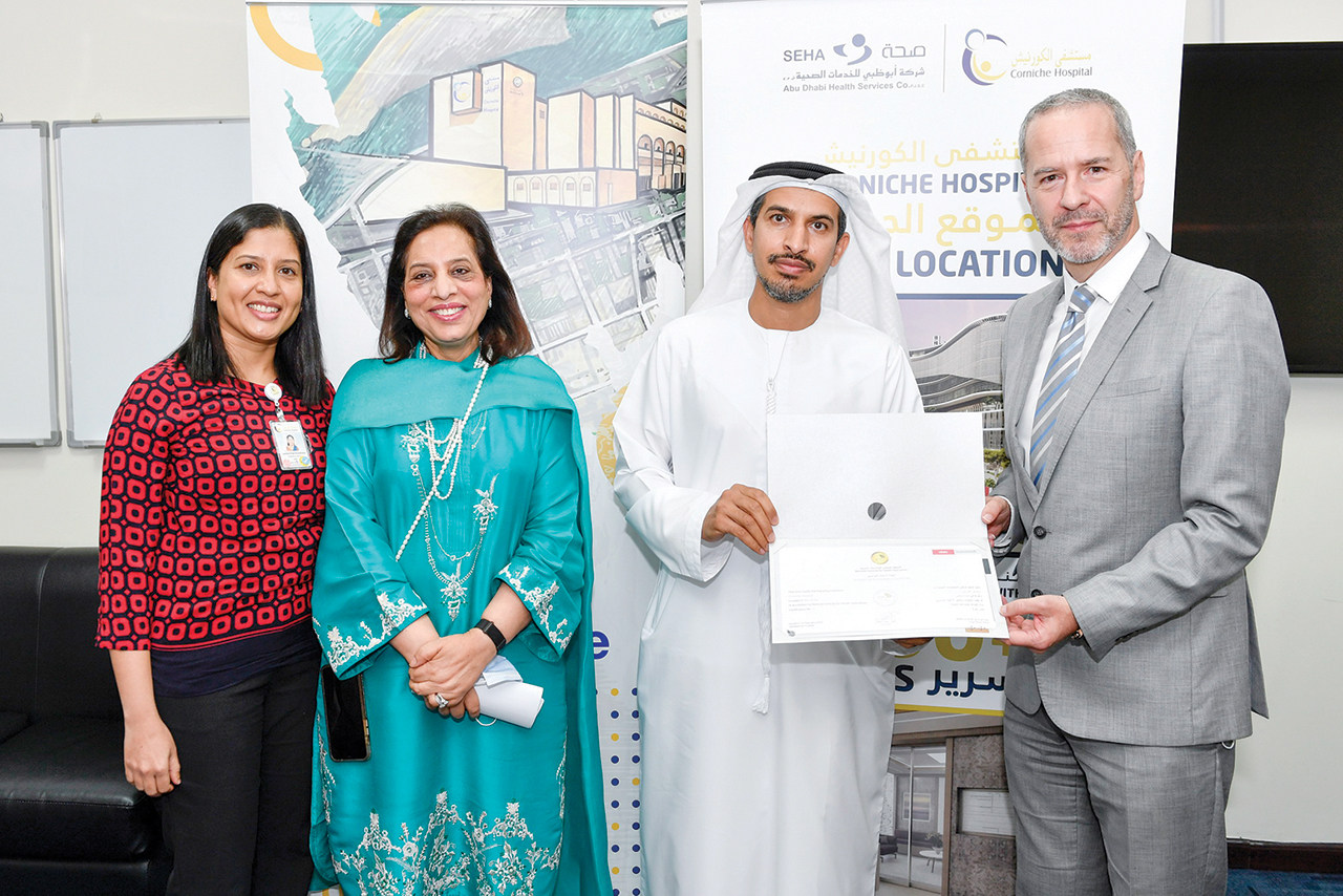 سلم الدكتور محمد الحوقاني، الأمين العام للمعهد الوطني للتخصصات الصحية، المعهد الوطني المسؤول عن قيادة وتنظيم التطوير المهني للقوى العاملة في القطاع الصحي والملحق بجامعة الإمارات العربية المتحدة، شهادة الاعتماد المؤسسي إلى مستشفى الكورنيش وذلك بعد استيفائهم معايير الاعتماد المؤسسي للبورد الإماراتي، الأمر الذي سيسهم في اعتماد المستشفى لتدريب وتأهيل خريجي كليات الطب في مجال طب التوليد وأمراض النساء وطب حديثي الولادة.