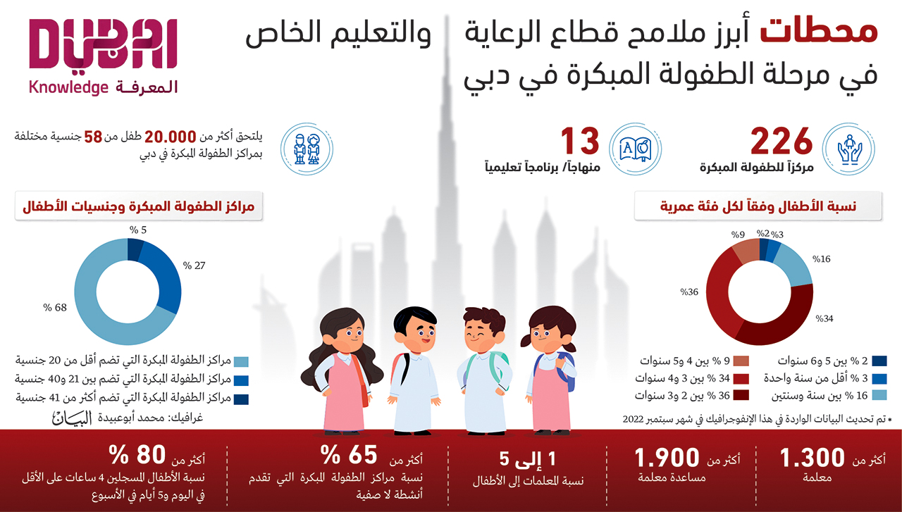 وأظهر إنفوجرافيك صادر عن الهيئة بعنوان: «محطات.. أبرز ملامح قطاع الرعاية والتعليم الخاص في مرحلة الطفولة المبكرة بدبي»، أن حوالي 70% من الأطفال الملتحقين بمراكز الطفولة المبكرة تتراوح أعمارهم من 2 إلى 4 سنوات، ما يعكس جاذبية قطاع الطفولة المبكرة كخيار تعليمي يلبي احتياجات أولياء الأمور في هذه المرحلة العمرية المهمة من نمو أطفالهم، إذ يسهم في بناء شخصيتهم وتكوين اللبنات الأولى في إدراكهم المعرفي في سن مبكرة.