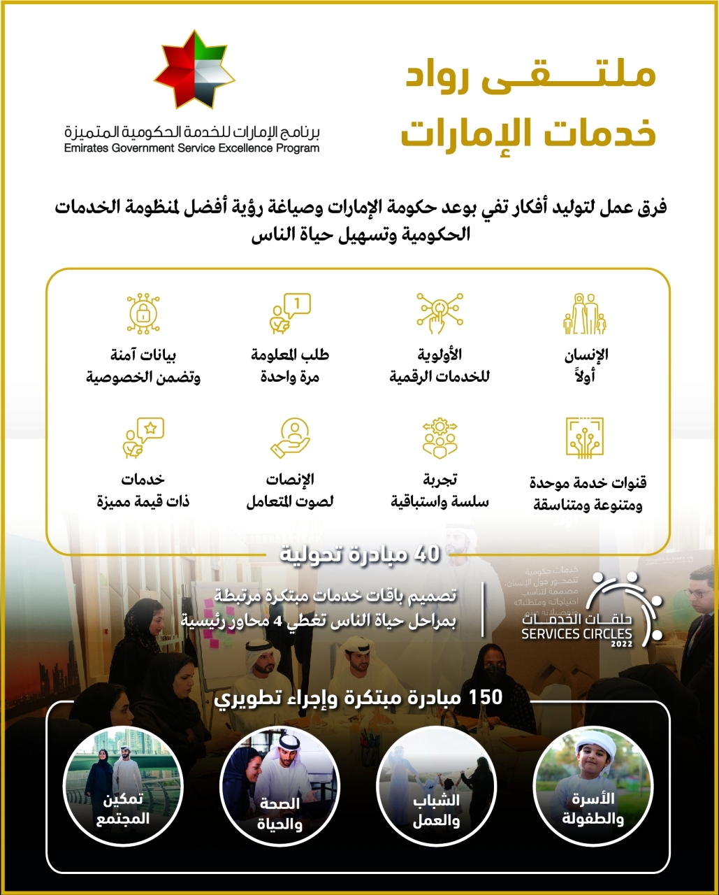 عقدت حكومة دولة الإمارات ملتقيات خدمات الإمارات بمشاركة أكثر من 140 قيادياً حكومياً ومختصاً في مجال الخدمات يعملون ضمن فرق عمل لتبادل الأفكار والخبرات وصياغة رؤية أفضل لمنظومة الخدمات الحكومية، التي بحثت ما يزيد على 190 مبادرة تحولية ومبتكرة للارتقاء بمستوى الخدمات المقدمة للمتعاملين، وتسريع وتيرة العمل وتطوير الخدمات لتسهيل حياة الناس وتعزيز جهود تطوير منظومة الخدمات الحكومية.