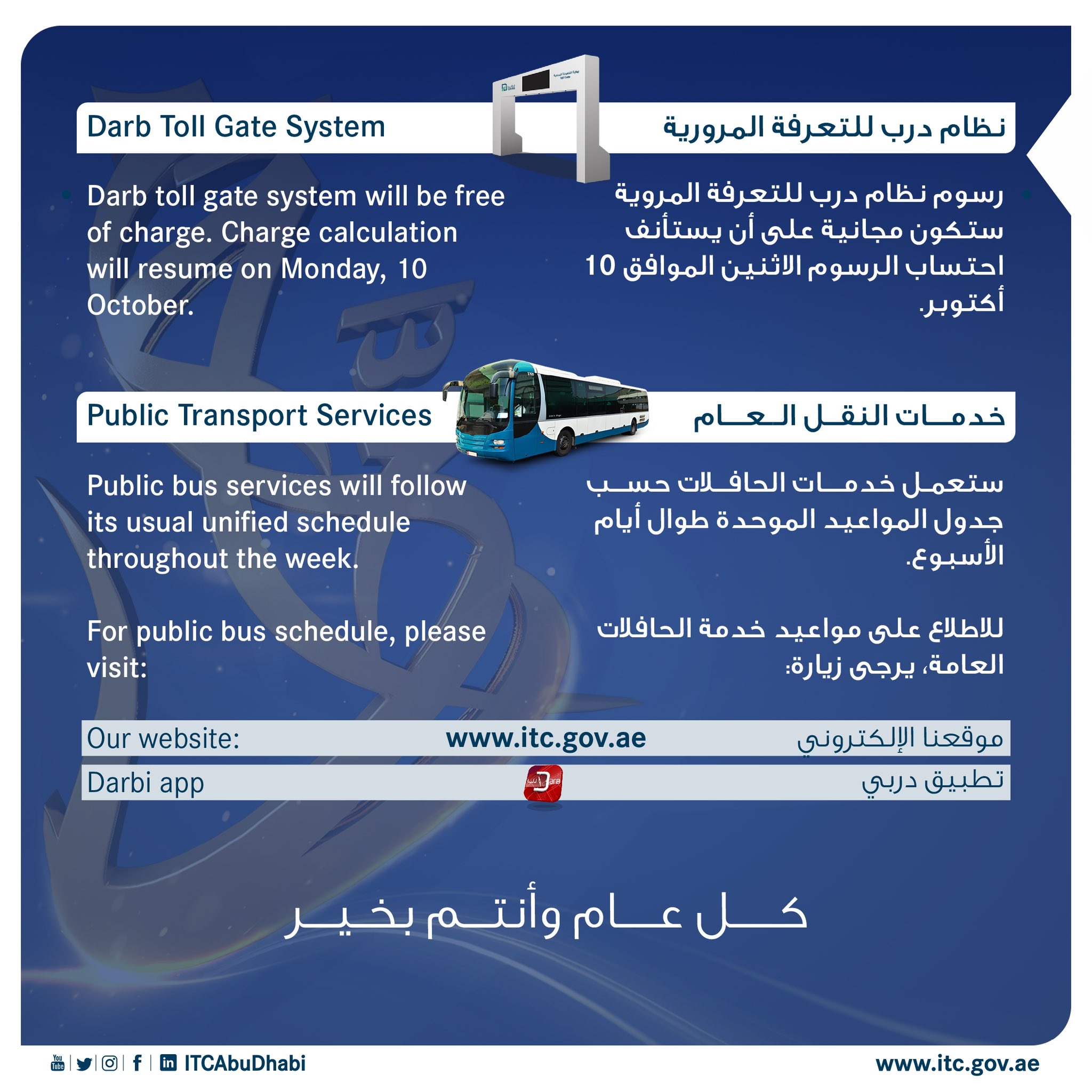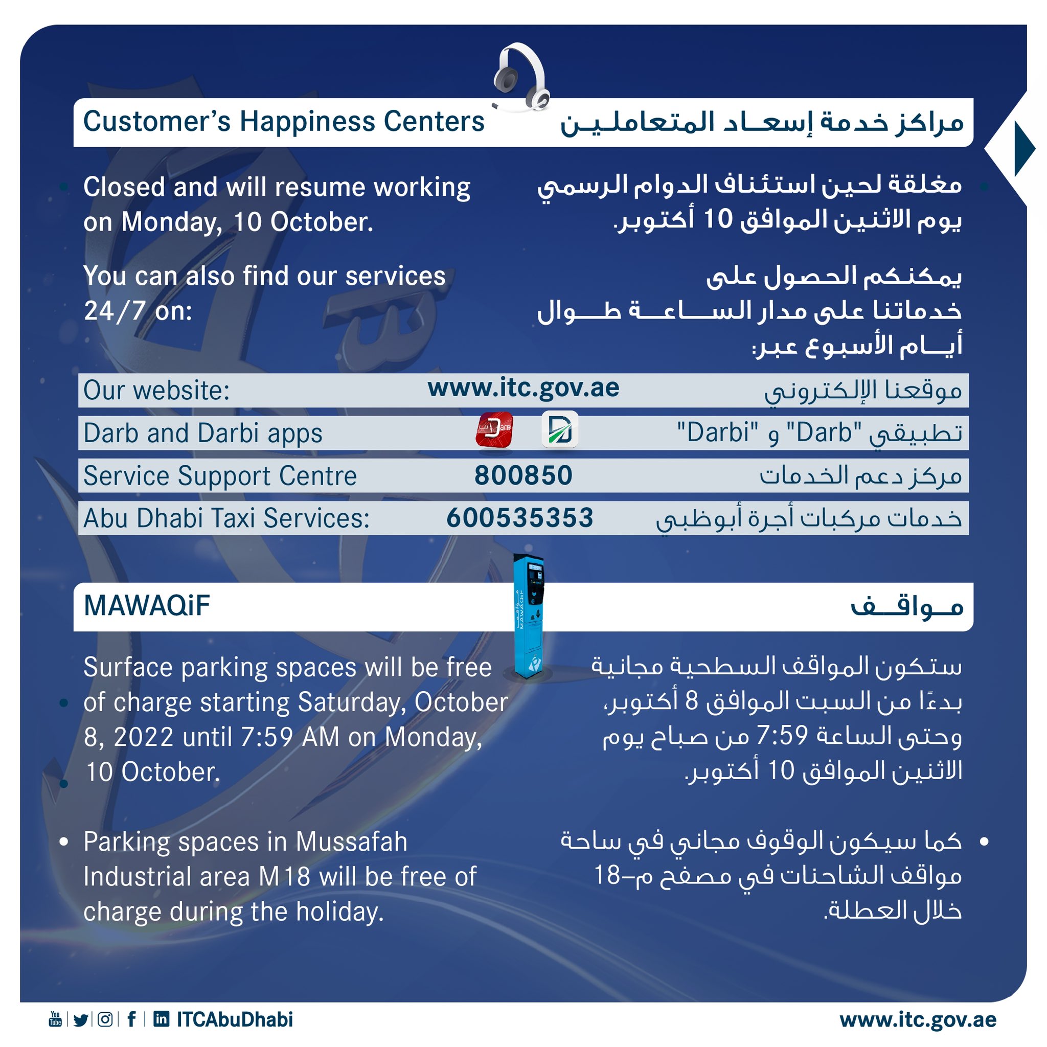 أعلن مركز النقل المتكامل التابع لدائرة البلديات والنقل في أبوظبي، مجانية رسوم خدمتي "مواقف" السطحية و"درب" اليوم السبت، احتفالاً بذكرى المولد النبوي الشريف، لافتاً إلى أنه سيتم استئناف احتساب رسوم الخدمتين مجدداً اعتباراً من يوم الاثنين المقبل (وفقاً للمواعيد المحددة لكل خدمة).