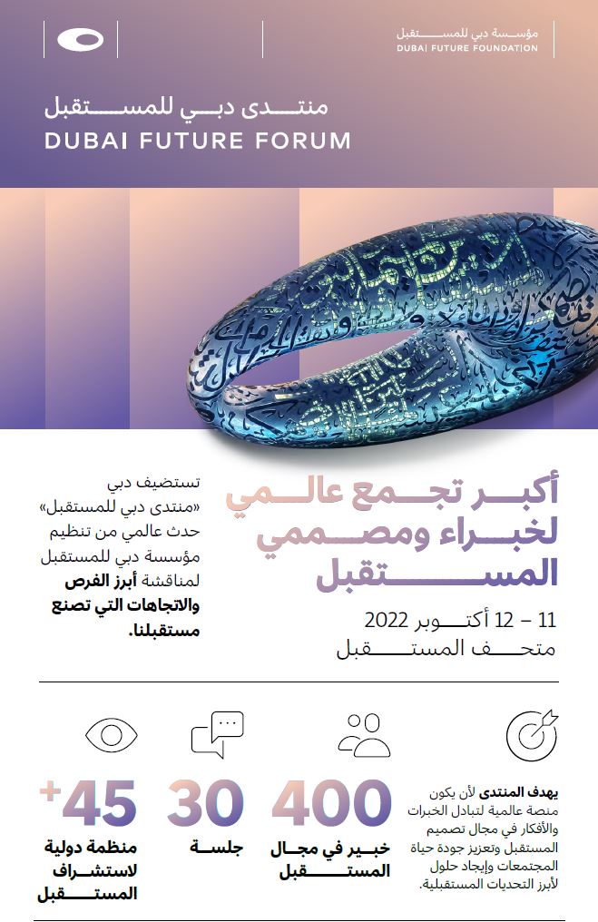 برعاية سمو الشيخ حمدان بن محمد بن راشد آل مكتوم ولي عهد دبي رئيس المجلس التنفيذي رئيس مجلس أمناء مؤسسة دبي للمستقبل، تنطلق فعاليات "منتدى دبي للمستقبل" يوم الثلاثاء 11 أكتوبر في "متحف المستقبل" بمشاركة أكثر من 45 مؤسسة عالمية لاستشراف المستقبل وأكثر من 400 من خبراء ومصممي المستقبل.