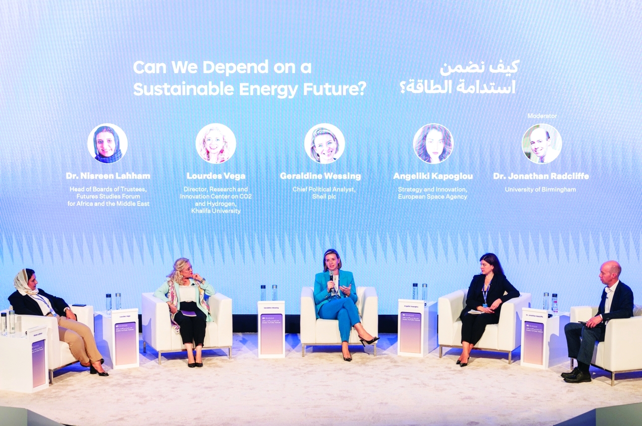 شارك في الجلسة كل من الدكتورة نسرين لحام رئيس مجالس الأمناء، بمنتدى الدراسات المستقبلية لأفريقيا والشرق الأوسط، ولورديس فيغا، مديرة مركز البحث والابتكار حول ثاني أكسيد الكربون والهيدروجين بجامعة خليفة، وجيرالدين ويسينغ كبيرة المحللين السياسيين في شركة «شل»، وأنجيليكي كابوغلو من قسم الاستراتيجيات والابتكار بوكالة الفضاء الأوروبية.