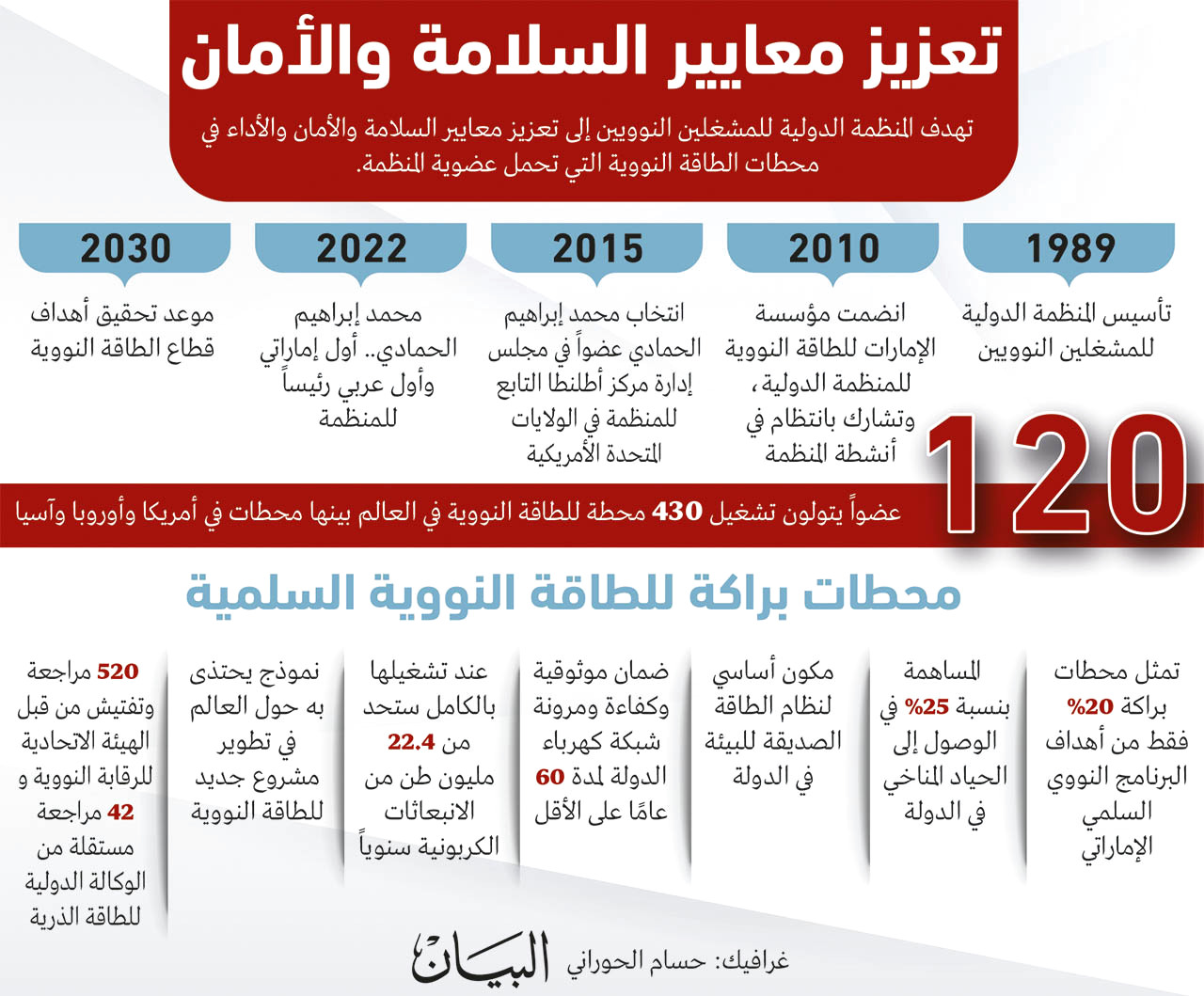 وفي ظل سعي العديد من الدول للانضمام إلى المنظمة الدولية للمشغلين النوويين لدعم خططها لتطوير منشآت جديدة للطاقة النووية، ينظر المجتمع الدولي إلى دولة الإمارات العربية المتحدة كنموذج يحتذى به في تطوير برنامج سلمي للطاقة النووية يلتزم بأعلى معايير السلامة والجودة والشفافية.