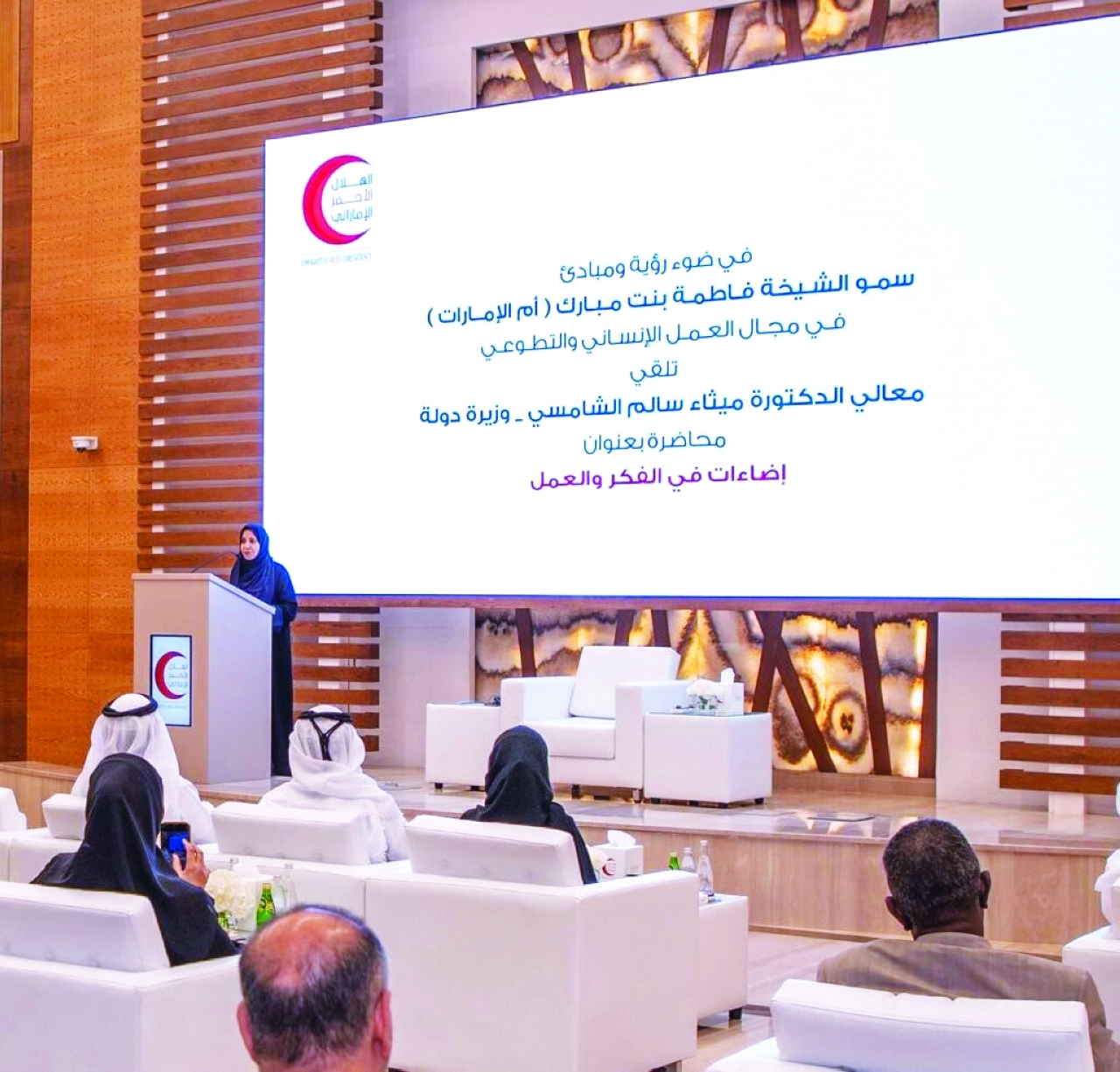 جاء ذلك خلال المحاضرة التي ألقتها معاليها بمقر الهلال الأحمر الإماراتي في أبوظبي، بعنوان «إضاءات في الفكر والعمل» من وحي رؤية سمو الشيخة فاطمة بنت مبارك، بحضور حمود عبدالله الجنيبي الأمين العام المكلف للهيئة، ونواب الأمين العام وعدد من المسؤولين والعاملين والمتطوعين في الهيئة.