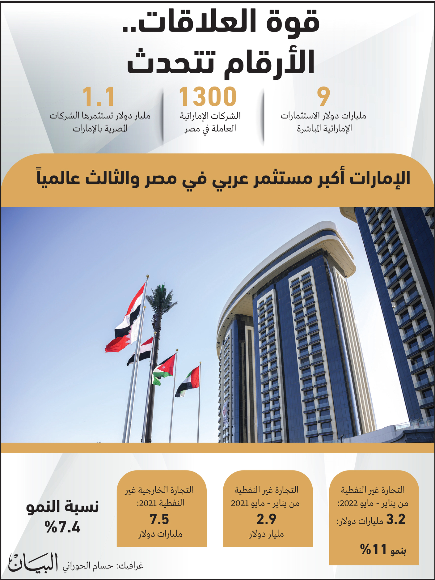 وعبر صاحب السمو الشيخ محمد بن زايد آل نهيان رئيس الدولة، حفظه الله، عن نفس المعنى بالقول: «مصر دولة عربية رئيسة وركيزة أساسية من ركائز الأمن العربي، ونعد أمن مصر من أمن الإمارات، وتقدمها وتطورها واستقرارها يمثل مصلحة للإمارات وكل العرب».