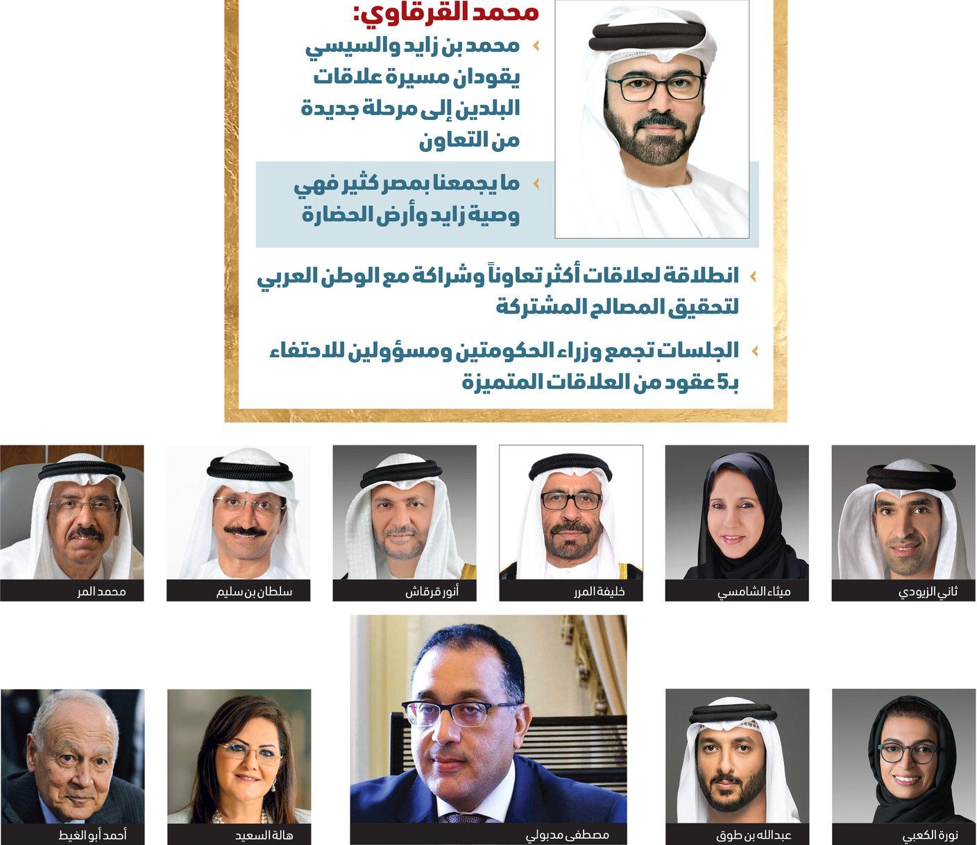 وقال القرقاوي إن صاحب السمو الشيخ محمد بن زايد آل نهيان والرئيس المصري عبدالفتاح السيسي يقودان مسيرة العلاقات المتميزة بين البلدين إلى مرحلة جديدة من الشراكة والتعاون.