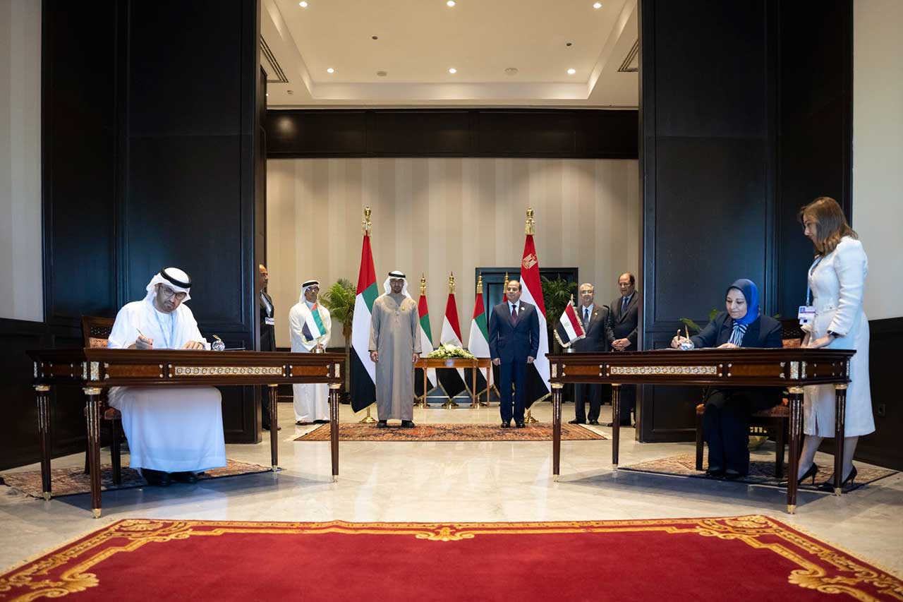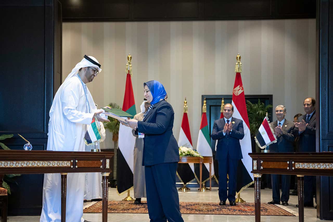 وقع الاتفاقية.. معالي الدكتور سلطان بن أحمد الجابر وزير الصناعة والتكنولوجيا المتقدمة المبعوث الخاص لدولة الإمارات للتغير المناخي رئيس مجلس إدارة " مصدر" وصباح محمد مشالي رئيس مجلس الإدارة العضو المنتدب للشركة المصرية لنقل الكهرباء .. وذلك على هامش أعمال الدورة السابعة والعشرين لمؤتمر الأطراف في اتفاقية الأمم المتحدة الإطارية بشأن تغير المناخ (COP27) التي تستضيفه مدينة مدينة شرم الشيخ.