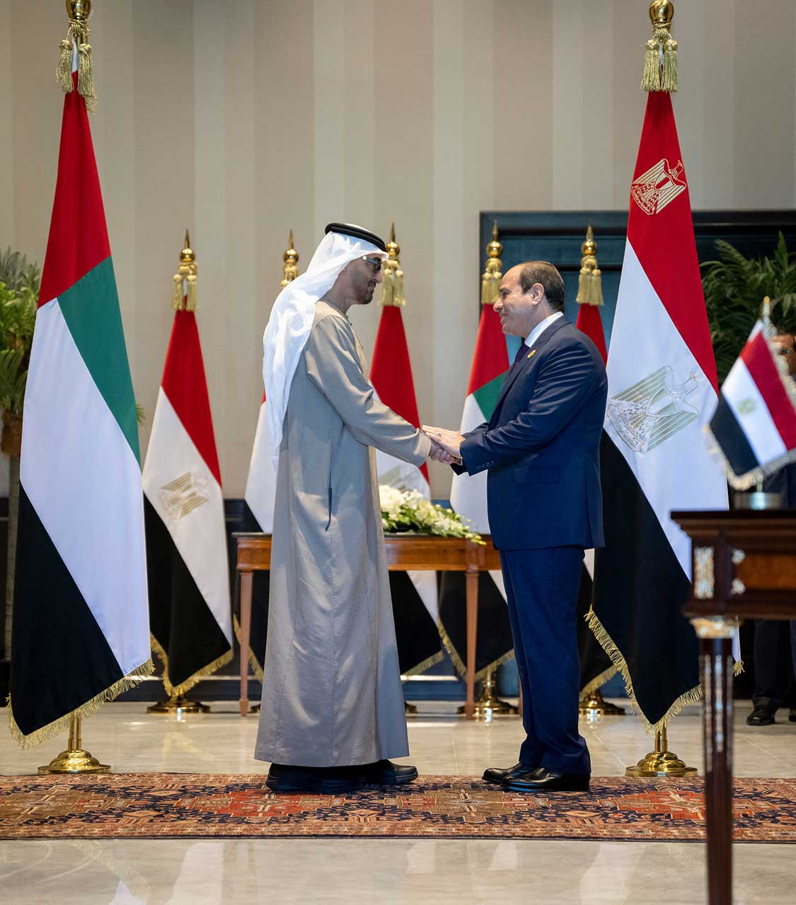 حضر مراسم التوقيع.. سمو الشيخ منصور بن زايد آل نهيان نائب رئيس مجلس الوزراء وزير ديوان الرئاسة و سمو الشيخ عبدالله بن زايد آل نهيان وزير الخارجية والتعاون الدولي وسمو الشيخ حمدان بن محمد بن زايد آل نهيان ومعالي الشيخ محمد بن حمد بن طحنون آل نهيان مستشار الشؤون الخاصة في ديوان الرئاسة وعدد من كبار المسؤولين من البلدين.