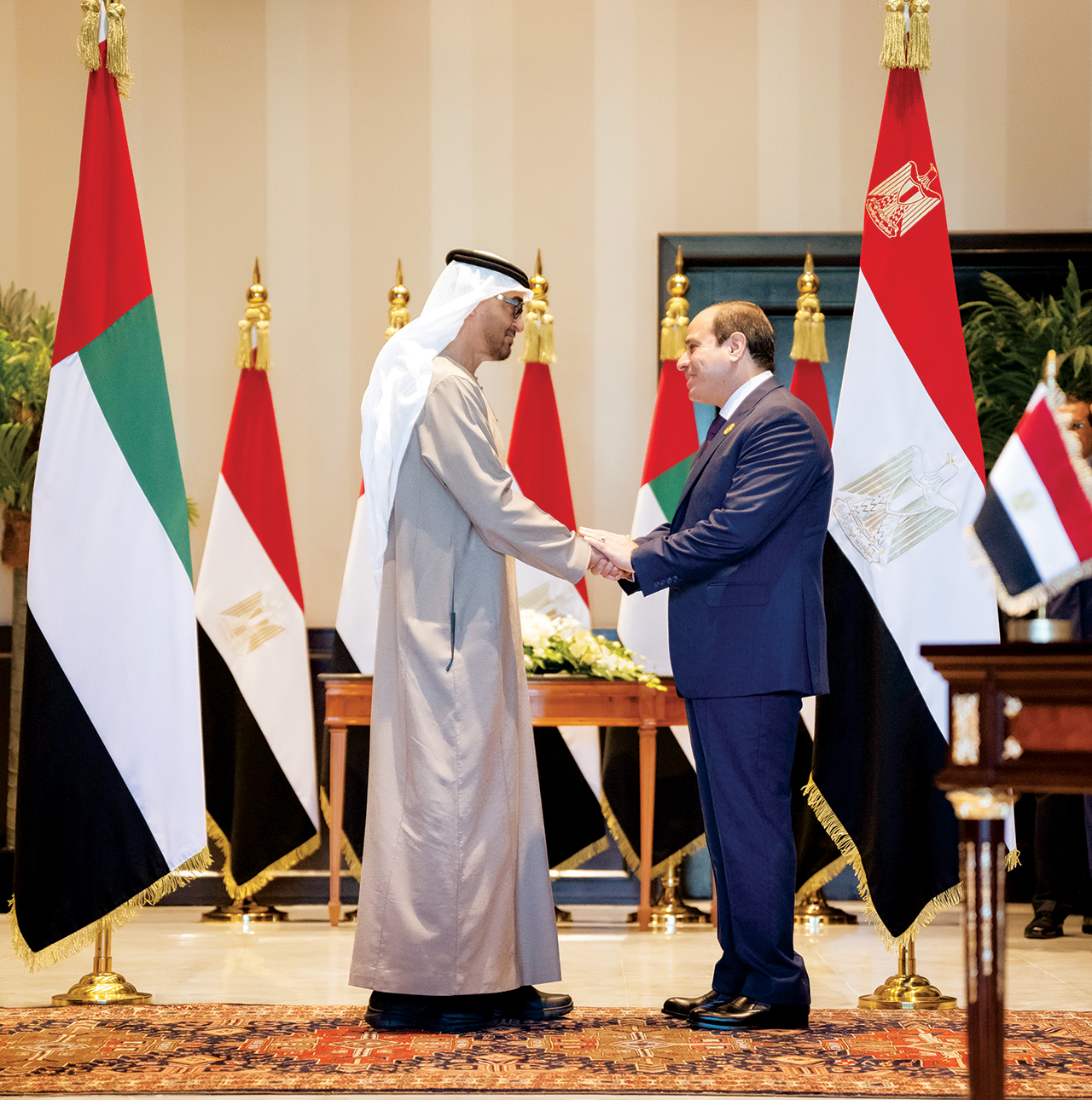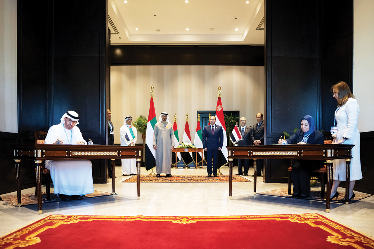 ودون صاحب السمو الشيخ محمد بن زايد آل نهيان عبر «تويتر»: «شهدت وفخامة الرئيس عبدالفتاح السيسي توقيع اتفاقية لإنشاء أحد أكبر مشاريع طاقة الرياح في مصر بقدرة 10 جيجاواط.. سنمضي في تنفيذ مبادرات نوعية لحلول الطاقة المتجددة وتعزيز التنمية المستدامة».