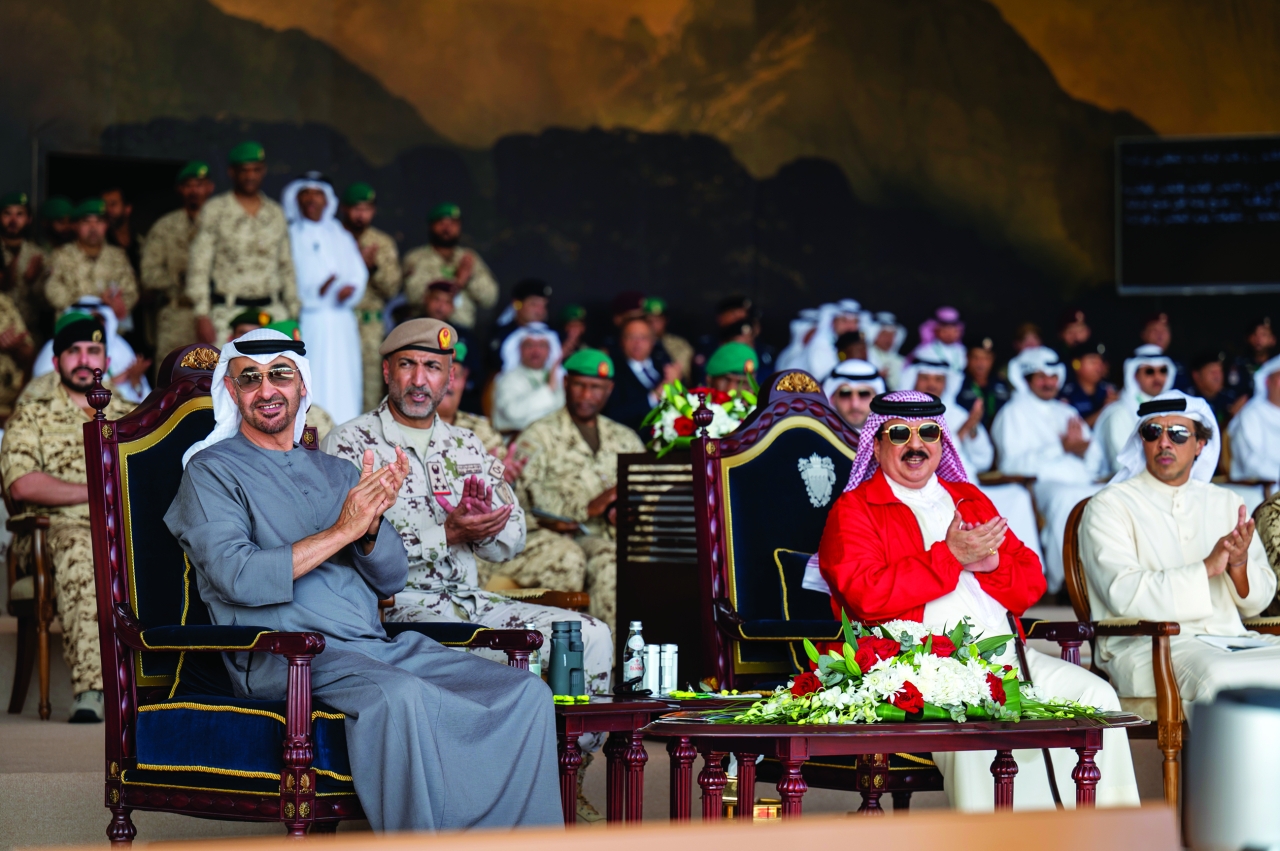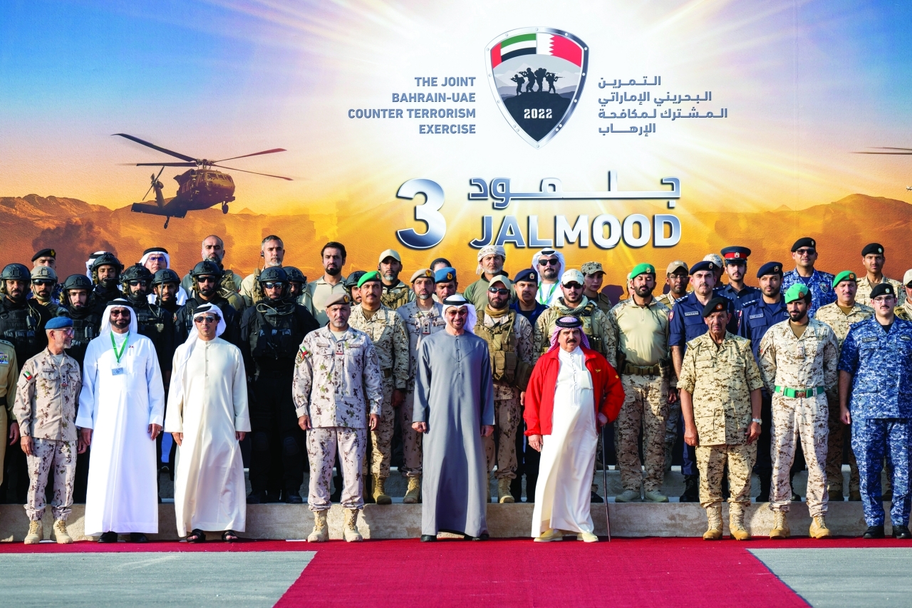 شهد صاحب السمو الشيخ محمد بن زايد آل نهيان رئيس الدولة، حفظه الله، والملك حمد بن عيسى آل خليفة عاهل مملكة البحرين الشقيقة، أمس، المرحلة الختامية من التمرين الإماراتي ــ البحريني المشترك لمكافحة الإرهاب «جلمود 3».