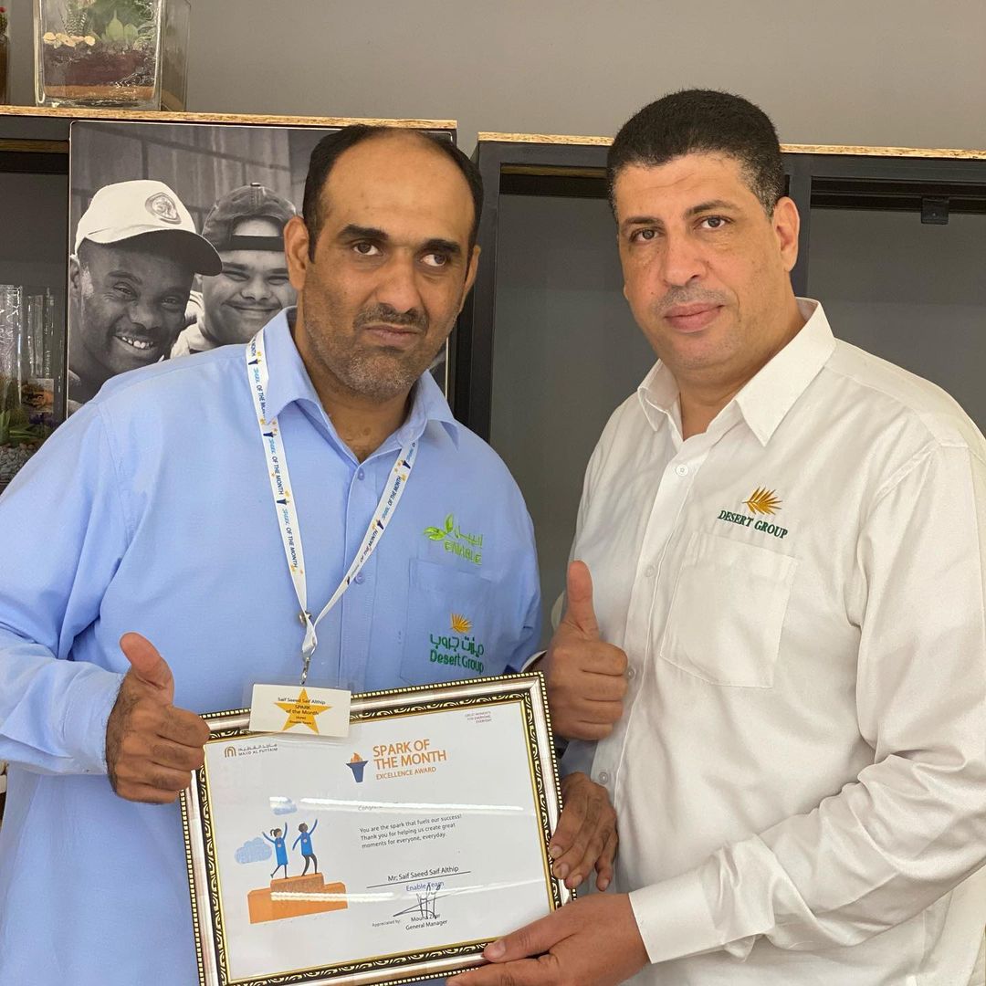 لم تكن همومه يوماً مرتبطة بوسائل العيش كفرد من أصحاب الهمم.. كيف سيعيش، ومن سيعوله، حيث يعاني من إعاقة ذهنية بسيطة منذ الولادة، ما دفعه للالتحاق بمركز دبي لرعاية أصحاب الهمم منذ طفولته المبكرة..فقد كان الأمر واضحاً له بأنه يعيش في مجتمع كفل له جميع حقوقه.. ولكن كانت هموم «سيف الذيب»، 37 عاماً، تتمحور حول حلمه بأن يكون عنصراً فاعلاً في المجتمع.. يعطي ويأخذ.. ولا يقتصر دوره على تلقي المساعدة، شغله الأمر كثيراً ولكنه واصل البحث إلى أن وصل إلى مبادرة «ديزرت جروب» وقام بتقديم أوراقه للعمل ليتحقق حلمه بأن يصبح عنصراً فاعلاً في المجتمع.