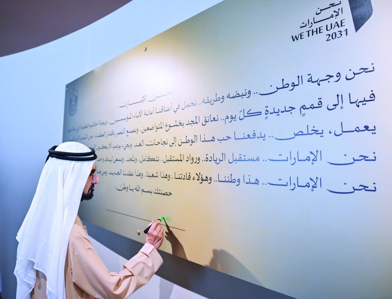 ووقّع صاحب السمو الشيخ محمد بن راشد آل مكتوم، على هامش إطلاق «نحن الإمارات 2031» على وثيقة تمثل أهم ملامح الرؤية الوطنية، وما تمثله من مبادئ وتوجهات لحكومة الإمارات وتجسد الترابط والتكامل والتطلع للمستقبل، حيث تنطلق الرؤية من كلمة «نحن الإمارات»، والتي اقتبست من كلمة «نحن» والتي تعد أول كلمة في دستور الإمارات.