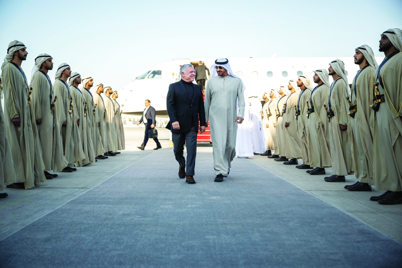بحث صاحب السمو الشيخ محمد بن زايد آل نهيان رئيس الدولة، حفظه الله، مع أخيه الملك عبد الله الثاني بن الحسين عاهل المملكة الأردنية الهاشمية، أمس، العلاقات الأخوية الوثيقة التي تجمع البلدين، ومختلف جوانب التعاون والعمل المشترك، الذي يحقق مصالحهما المتبادلة.