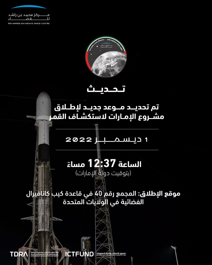 أعلن مركز محمد بن راشد للفضاء تأجيل موعد إطلاق المستكشف «راشد» نحو سطح القمر، وأفاد بأن موعد إطلاق مشروع الإمارات لاستكشاف القمر سيكون يوم غد في 1 ديسمبر 2022 عند الساعة 12:37 مساءً (بتوقيت دولة الإمارات).