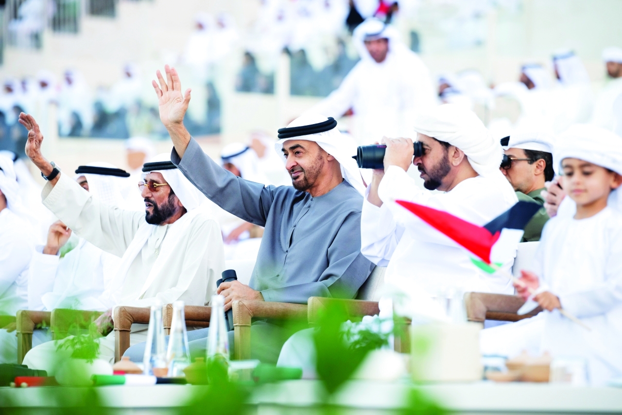 شهد صاحب السمو الشيخ محمد بن زايد آل نهيان رئيس الدولة، حفظه الله، أمس، «مسيرة الاتحاد» التي ينظمها بمناسبة «عيد الاتحاد الـ51» لدولة الإمارات ديوان الرئاسة، بمشاركة أبناء القبائل من مختلف ربوع الوطن، والتي أقيمت في منطقة الوثبة.