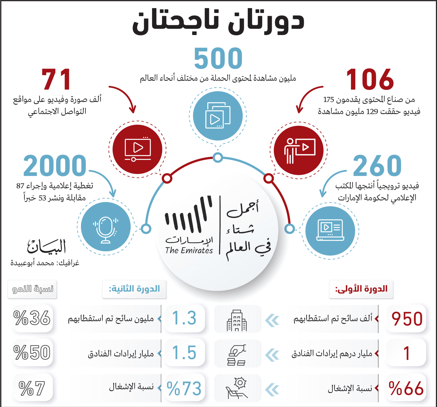 وفي الدورة الثانية تم تحقيق نتائج اقتصادية نوعية للسياحة الداخلية رفعت إيرادات المنشآت الفندقية إلى 1.5 مليار درهم مقارنة بـ 1 مليار درهم في النسخة الأولى من الحملة بزيادة بنسبة 50 % هذا العام. ورفعت الحملة في دورتها الثانية عدد السياح المحليين من 950 ألفاً إلى 1.3 مليون سائح، بزيادة نسبتها 36 % عن النسخة الأولى للحملة، ووصلت نسبة إشغال المؤسسات الفندقية في هذه الفترة إلى 73 % مقارنة بـ 66 % نسبة الإشغال في الدولة الأولى بزيادة نسبتها 7 % عن معدل إشغال الدورة الأولى.