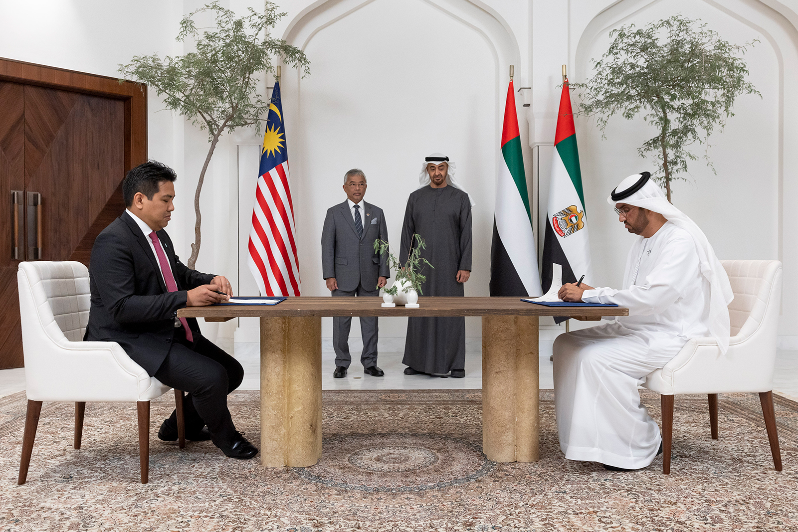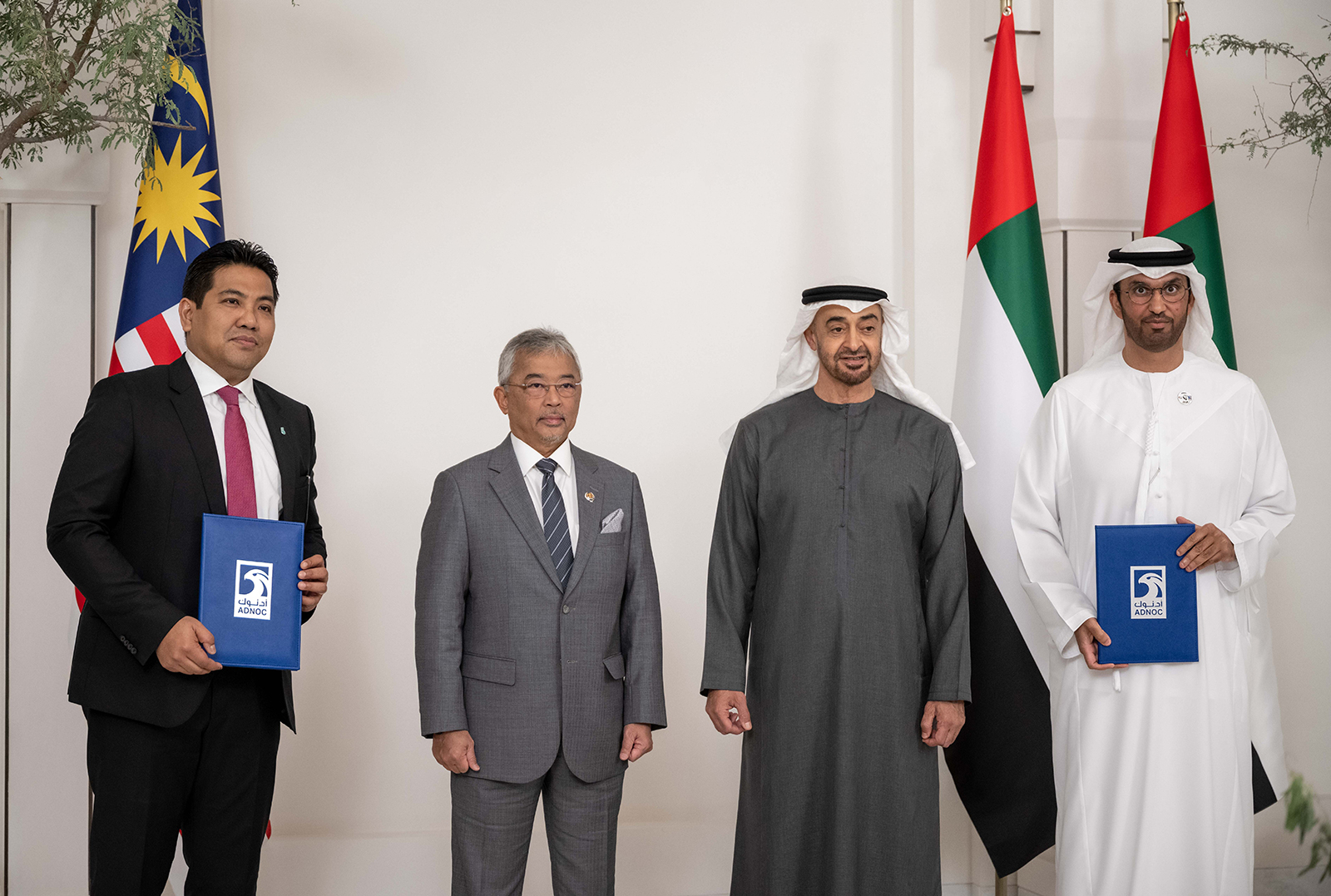 شهد صاحب السمو الشيخ محمد بن زايد آل نهيان رئيس الدولة "حفظه الله" وصاحب الجلالة السلطان عبدالله رعاية الدين المصطفى بالله شاه ملك ماليزيا الصديقة ــ الذي يقوم بزيارة عمل إلى الدولة ــ مراسم توقيع اتفاقية امتياز تاريخية بين شركة بترول أبوظبي الوطنية " أدنوك " وشركة النفط والغاز الوطنية الماليزية " بتروناس" للمنطقة البرية "رقم 1" في أبوظبي التي تحتوي موارد غير تقليدية.