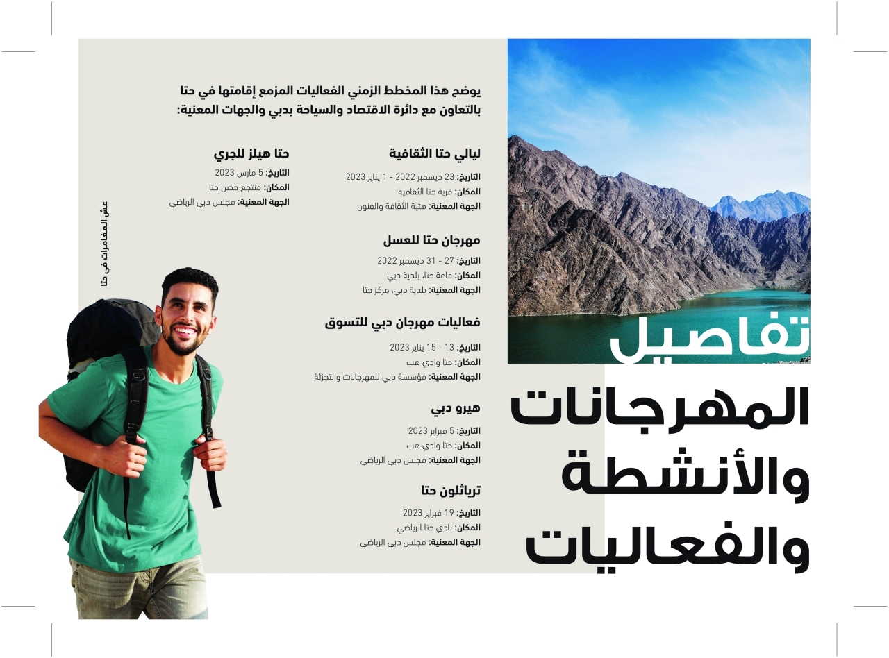 أعدّت اللجنة العليا للإشراف على تطوير منطقة حتا، حملة (حتا.. دبي الجبلية)، وتشمل باقة متنوعة من المبادرات والأنشطة، لتوفير تجربة سياحية فريدة في حتا، بهدف أن تكون المنطقة وجهة سياحية جذابة تزامناً مع حملة «وجهات دبي»، وحملة «أجمل شتاء في العالم»، وذلك في إطار الخطة الشاملة لتطوير منطقة حتا التي أطلقها صاحب السمو الشيخ محمد بن راشد آل مكتوم للارتقاء بجودة الحياة، وتطوير الخدمات لسكان وزوار المنطقة، وتعزيز القُدرات الاجتماعية والاقتصادية والتعليمية. وتروج حملة (حتا.. دبي الجبلية) لعشرات المناطق المتنوعة بين التراثية والحديثة، والتي تجعلها أكثر جذباً للسائحين والراغبين في نيل قسط من الراحة، ومن أبرزها: