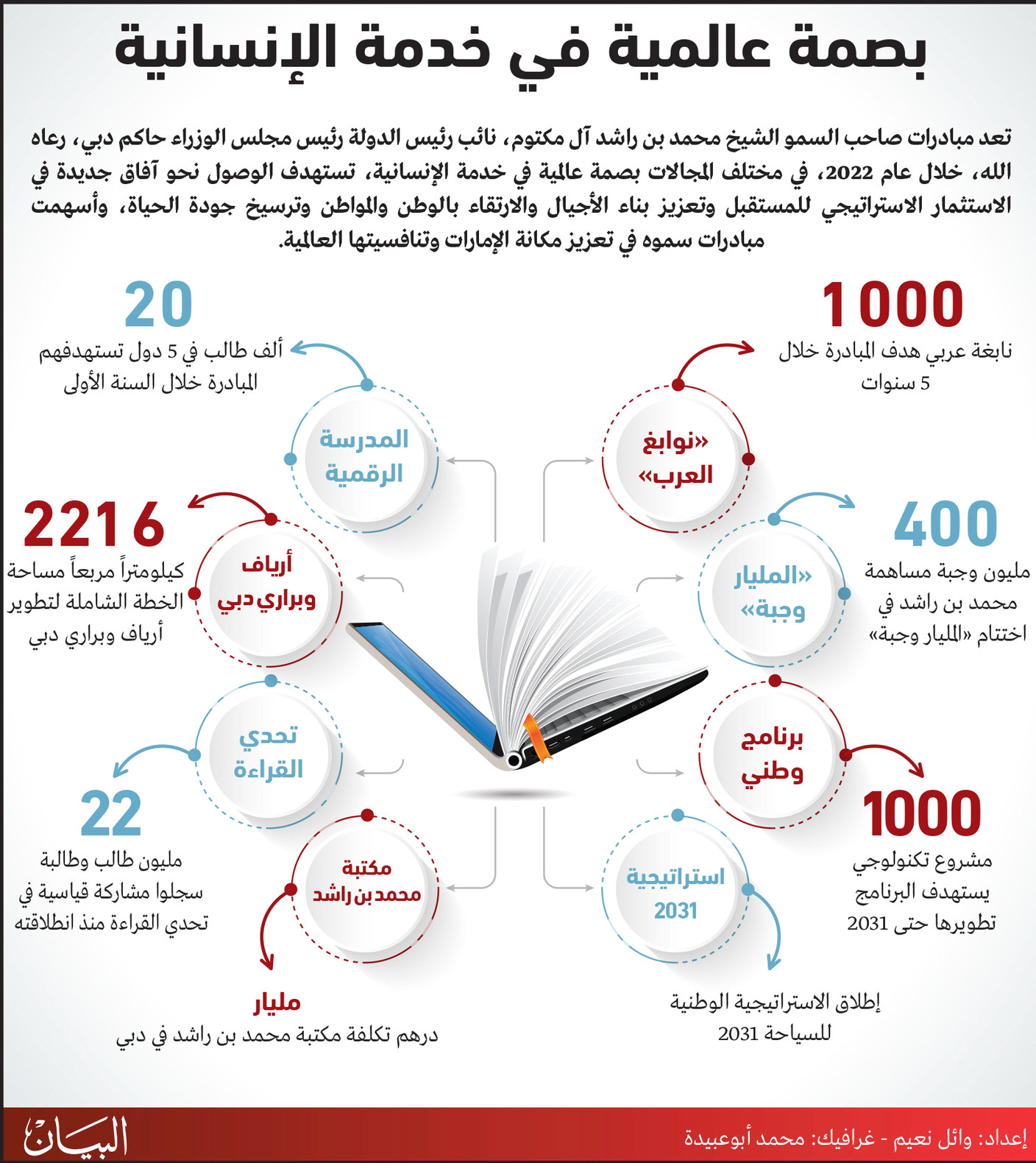 أطلق صاحب السمو الشيخ محمد بن راشد آل مكتوم نائب رئيس الدولة رئيس مجلس الوزراء حاكم دبي، رعاه الله، خلال عام 2022 العديد من الاستراتيجيات والمبادرات والبرامج الوطنية، وأصدر سموه قوانين ومراسيم وقرارات وتوجيهات، أسهمت في استشراف المستقبل وصناعته، ورسمت رؤية سموه خريطة طريق لمسيرة نجاح الوطن وإسعاد المواطن، وأسهمت في تعزيز جودة الحياة وتسريع تحقيق مستهدفات رؤية الإمارات المستقبلية في شتى المجالات، وركزت على استخدام التكنولوجيا للارتقاء بالقطاعات الرئيسية المرتبطة بحياة الإنسان وتوظيف الابتكار والتقنيات الحديثة في مختلف مجالات العمل والحياة، إضافة إلى تعزيز الخدمات الحكومية والبنية التحتية في الدولة، لخدمة الوطن والمواطن.