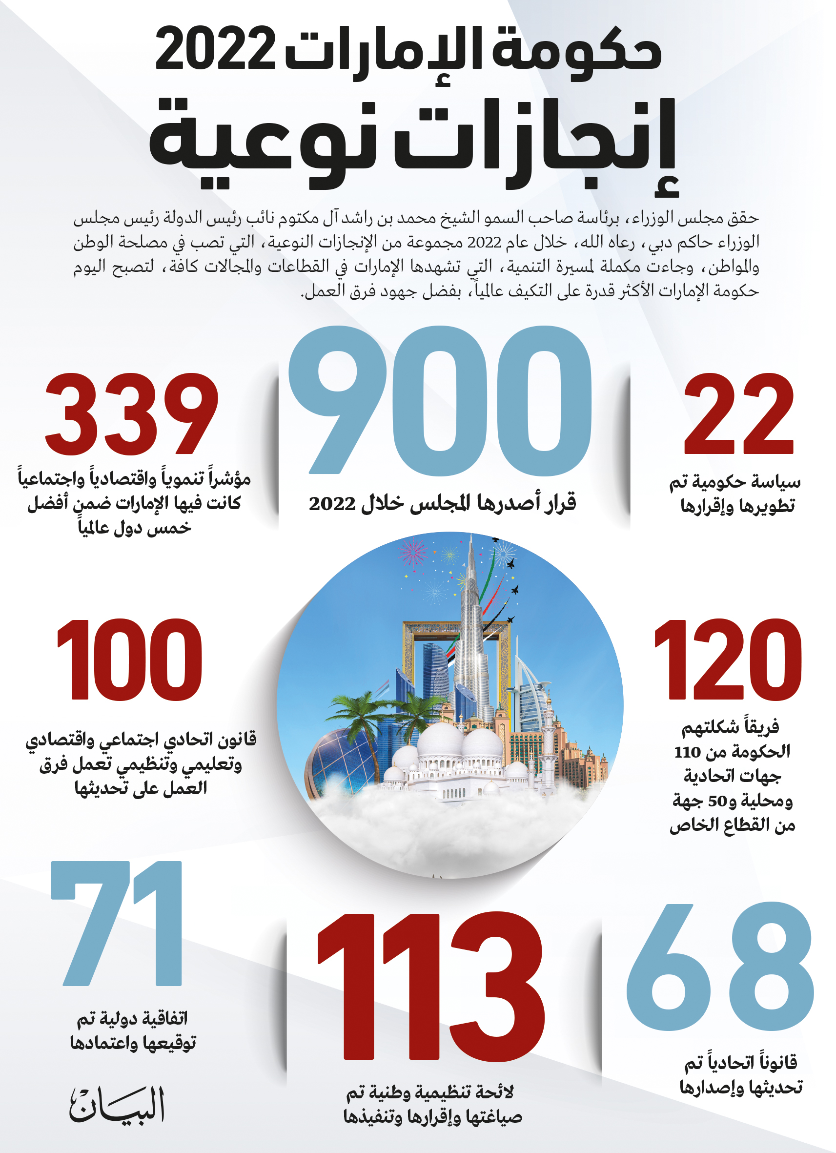وأضاف صاحب السمو الشيخ محمد بن راشد آل مكتوم: ترأست اليوم الاجتماع الأول لمجلس الوزراء في العام الجديد... استعرضنا خلاله حصيلة 2022... أكثر من 900 قرار أصدره مجلس الوزراء خلال العام... 22 سياسة حكومية تم تطويرها وإقرارها... 68 قانوناً اتحادياً تم تحديثها وإصدارها... و113 لائحة تنظيمية وطنية تم صياغتها وإقرارها وتنفيذها. وخلال 2022 تم توقيع واعتماد 71 اتفاقية دولية… ونبدأ اليوم عاماً جديداً أصبحت معه قطاعاتنا الاقتصادية والاجتماعية والبنية التحتية والرقمية أكثر استعداداً للمرحلة المقبلة.